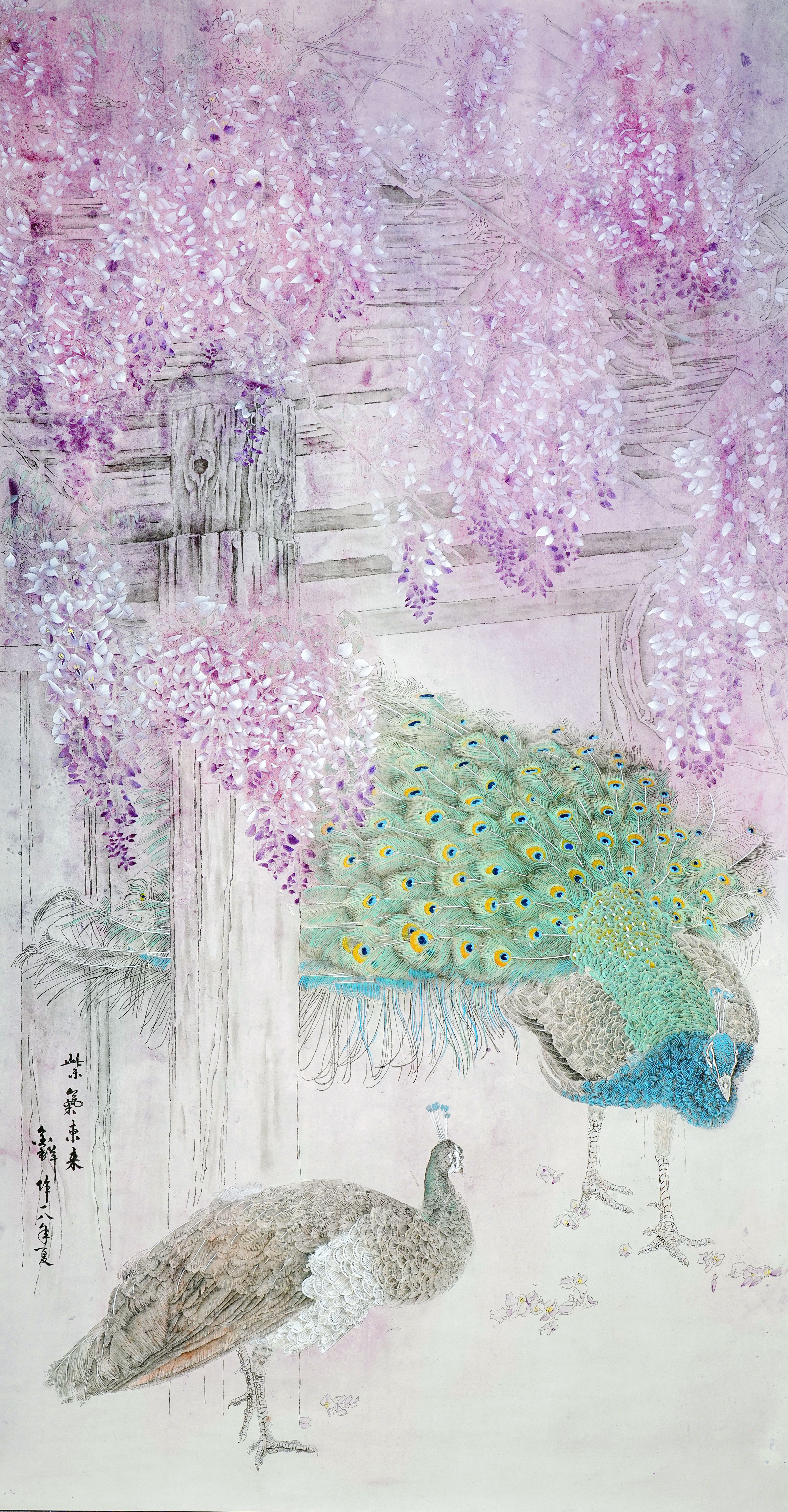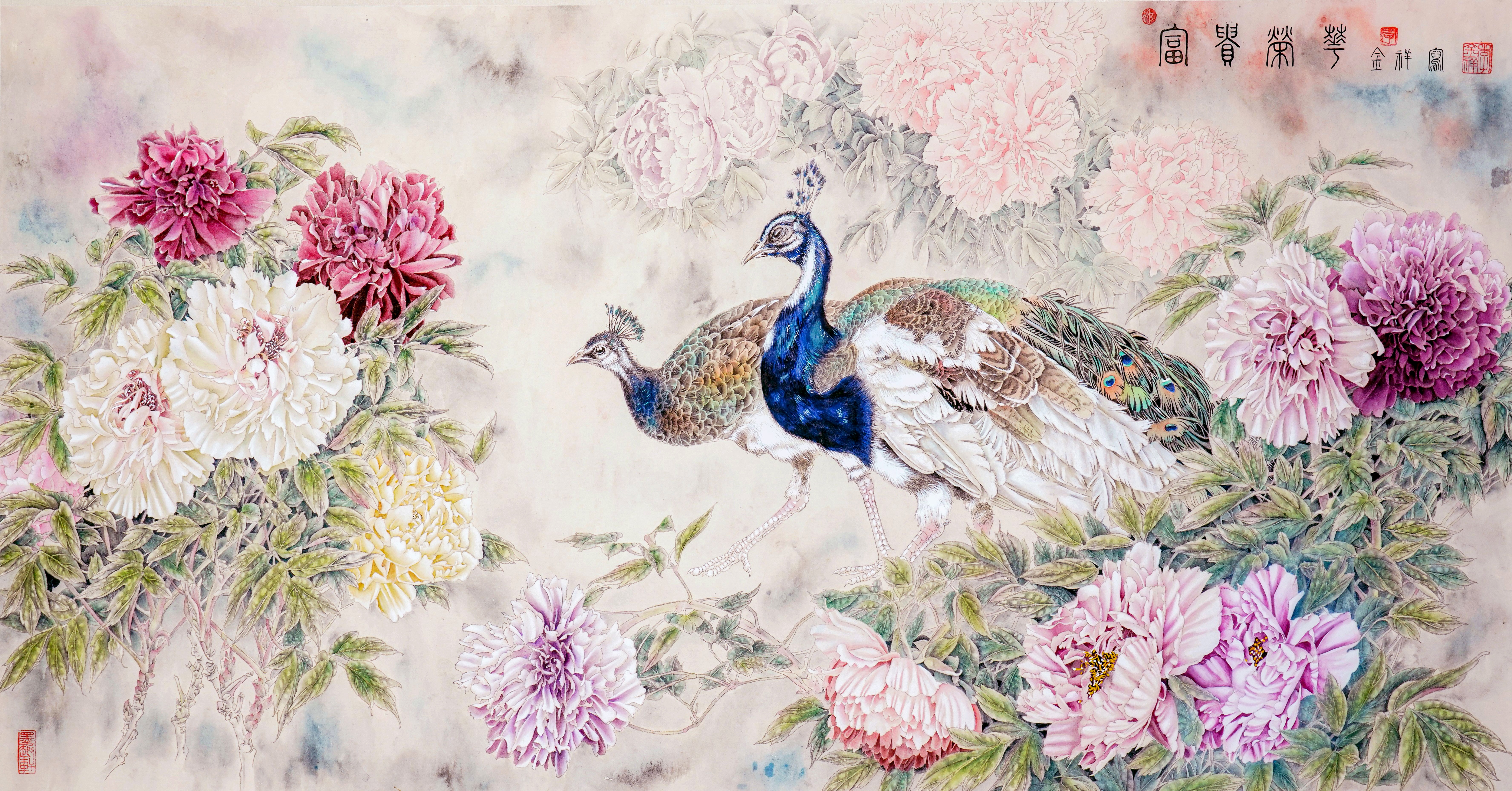百鳥戀千花,乾坤萬象新。傳統的工筆花鳥畫講究構圖與意境,李金祥的花鳥畫自然也不例外。但處於海納百川潮起潮湧的大時代,在相容並蓄的基礎上,不斷推陳出新,解構傳統結構,從全新視角描繪遠近景物,無疑是李金祥中段畫作的不懈追求。這一時期的畫作,花與鳥仍是他畫中一以貫之的主角,但畫面更為注重線段筆墨之間的「氣接」,畫中視角和構圖多變。花團千姿百態,飛鳥啼轉千回,觀畫如臨其境,仿佛置身仰止高山,雲遮霧繞,氣象萬千。畫作除了空靈自然的意境,還有恢弘磅礴的氣勢,給人視覺上更多的衝擊力和感受力。很難想見溫婉的花鳥畫,能夠跟「氣象萬千」和「磅礴氣勢」等辭彙聯繫起來,但這就是李金祥這一階段作品的最大特點。這一時期出現了許多優秀的作品,如《清氣滿乾坤》,《紫氣東來》等等,最為耀眼的是全國第十三屆美展作品入選作品《十里綠簾花捧天》。