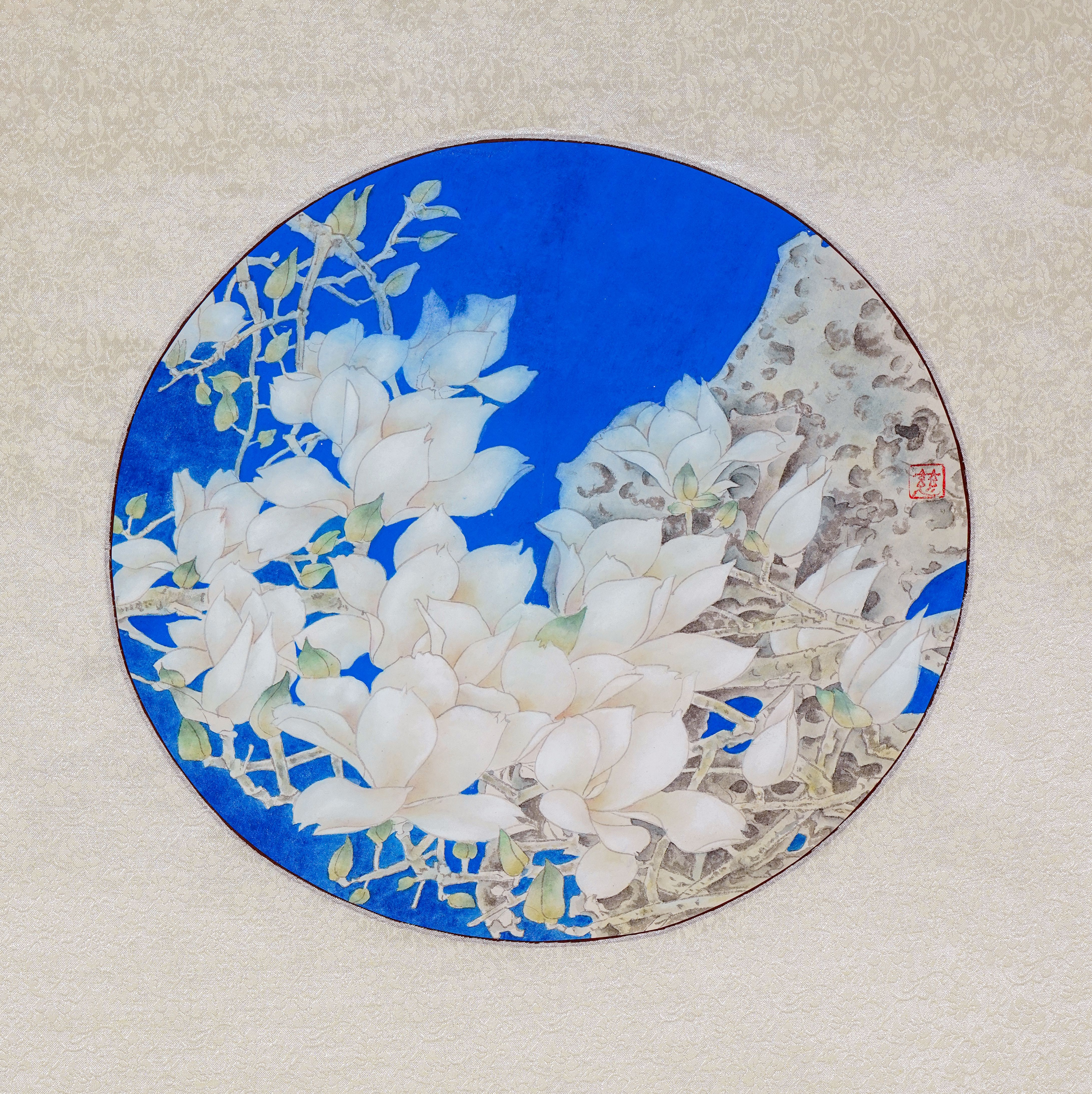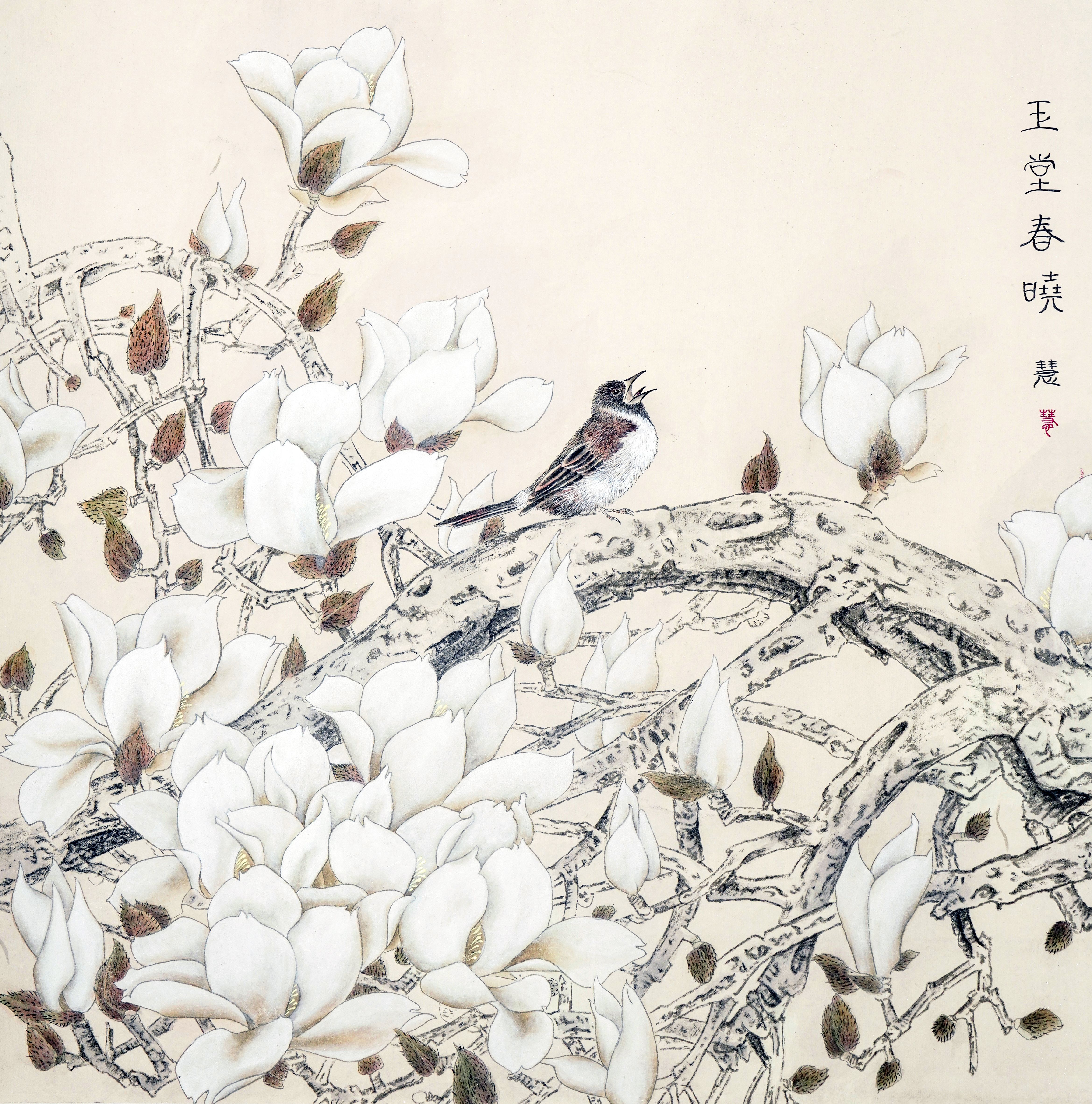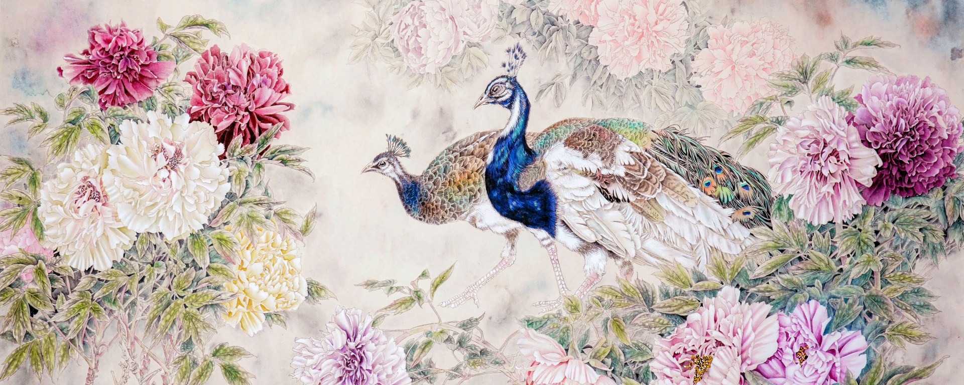 尚萬物和諧,崇人文之美。今時今日的李金祥,依然沉浸於繪畫藝術的天地,在傳授繪畫技法之餘,筆下的百鳥萬花,更為多姿多彩,生趣盎然。一個悄然的變化是,畫面中多了些許人文物事,如古建築局部,或為石凳石柱,或為屋簷瓦角,或為古厝樓閣,如《百年好合》、《南風撫蔥蘢》、《夢回故園》等作品,花鳥與這些古韻建築局部,如同片段截取般共處於一隅,一邊是四季更迭的春暖花開,一邊是百載默佇的滄桑古厝。相較於中國山水畫中山嶽的亙古巋然,這些畫作更有「采菊東籬下,悠然見南山」的韻味,只不過南山在畫外。「東籬采菊」顯然更生動詮釋了中國文化寧靜以致遠的意蘊。