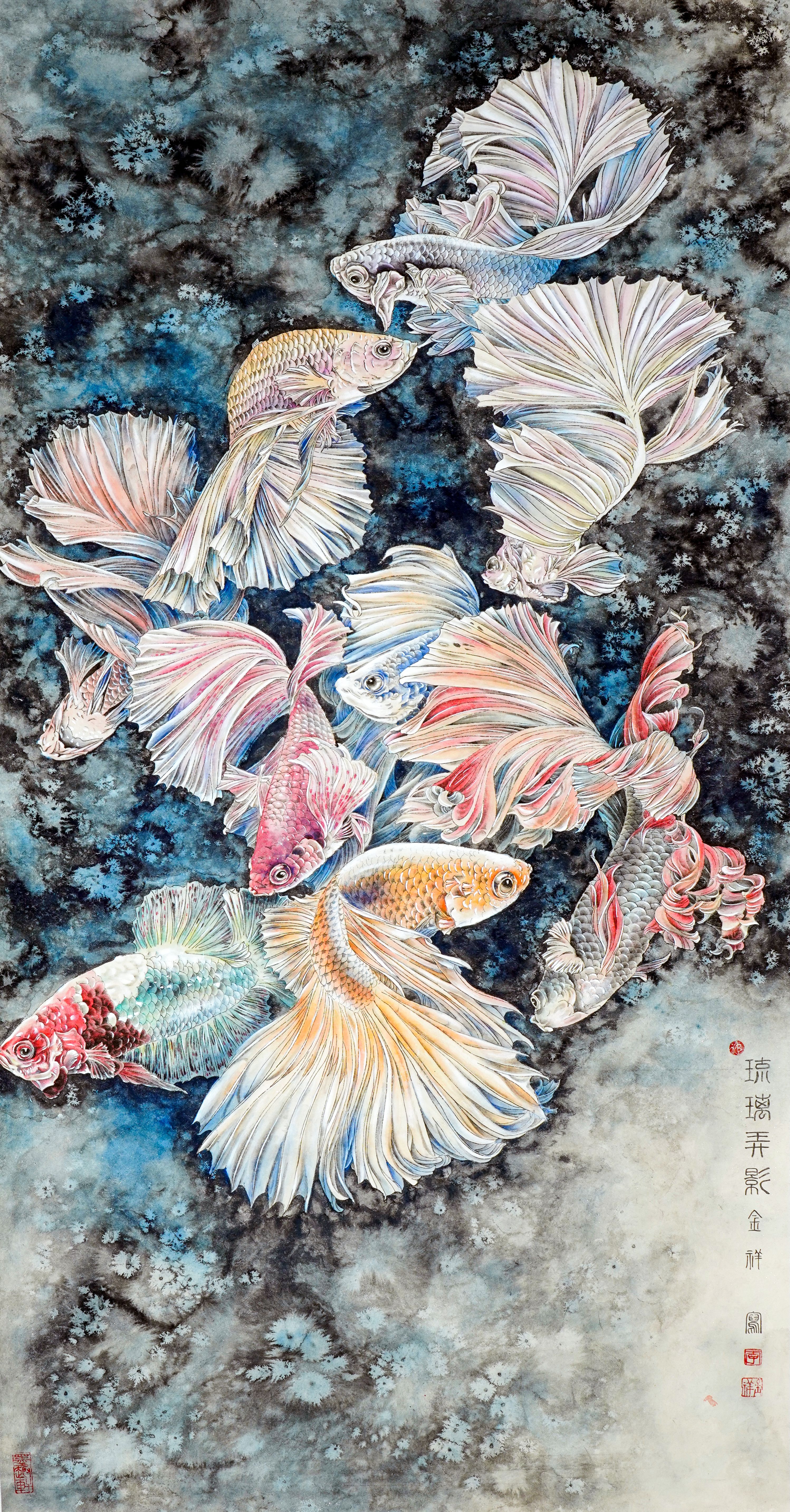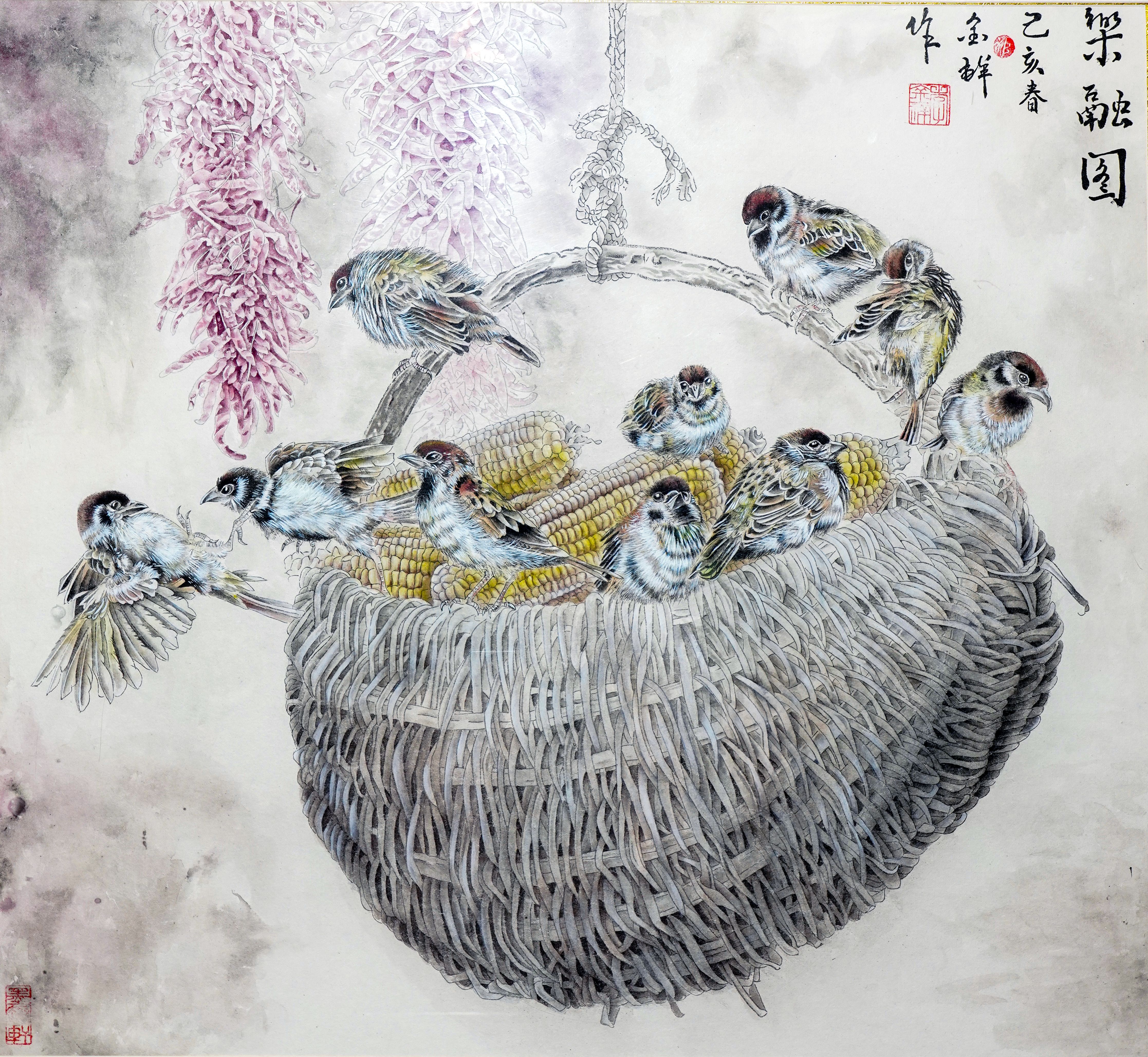 觀花鳥蟲魚,寫自然生趣。李金祥的畫,一直都有花鳥蟲魚的身影。畫卷中每有花繁似錦,鳥飛靈動,魚遊清池。展開畫卷,一時間花香鳥語,撲面而來,盡展各自天然之姿,卻無爭寵逐豔之貌。畫中韻味與中國傳統之「緣物寄情、寓意於景」一脈相承。李金祥以詳寫細描花鳥蟲魚為重心的這一階段,時間跨度較長,作品規制較多,也是繪畫技法不斷探索臻於完善的階段。早期代表作有《春韻》、《秋實》等。