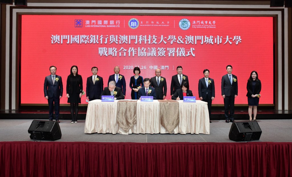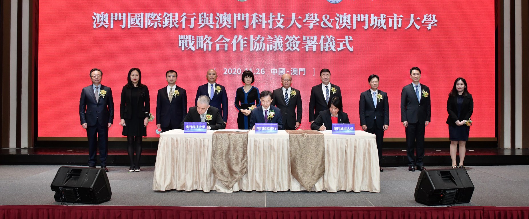 11月26日,澳門國際銀行與澳門科技大學、澳門城市大學在澳門旅遊塔舉行戰略合作協議簽署儀式。澳門高等教育局曾冠雄代局長,中聯辦經濟部朱宏副部長,全國政協常委、澳門科技大學校董會廖澤雲主席,全國政協委員、澳門城市大學校董會陳明金主席,澳門銀行公會葉兆佳主席,澳門中企協陳立新副理事長,廈門國際銀行王曉健董事長,澳門國際銀行焦雲迪總經理,澳門科技大學校董會陳季敏校董,澳門城市大學陳倩雯校董出席儀式並見證簽約,澳門國際銀行陳偉成副總經理與澳門城市大學孔繁清代校長及澳門科技大學唐家樂副校長代表銀校簽署合作協議。