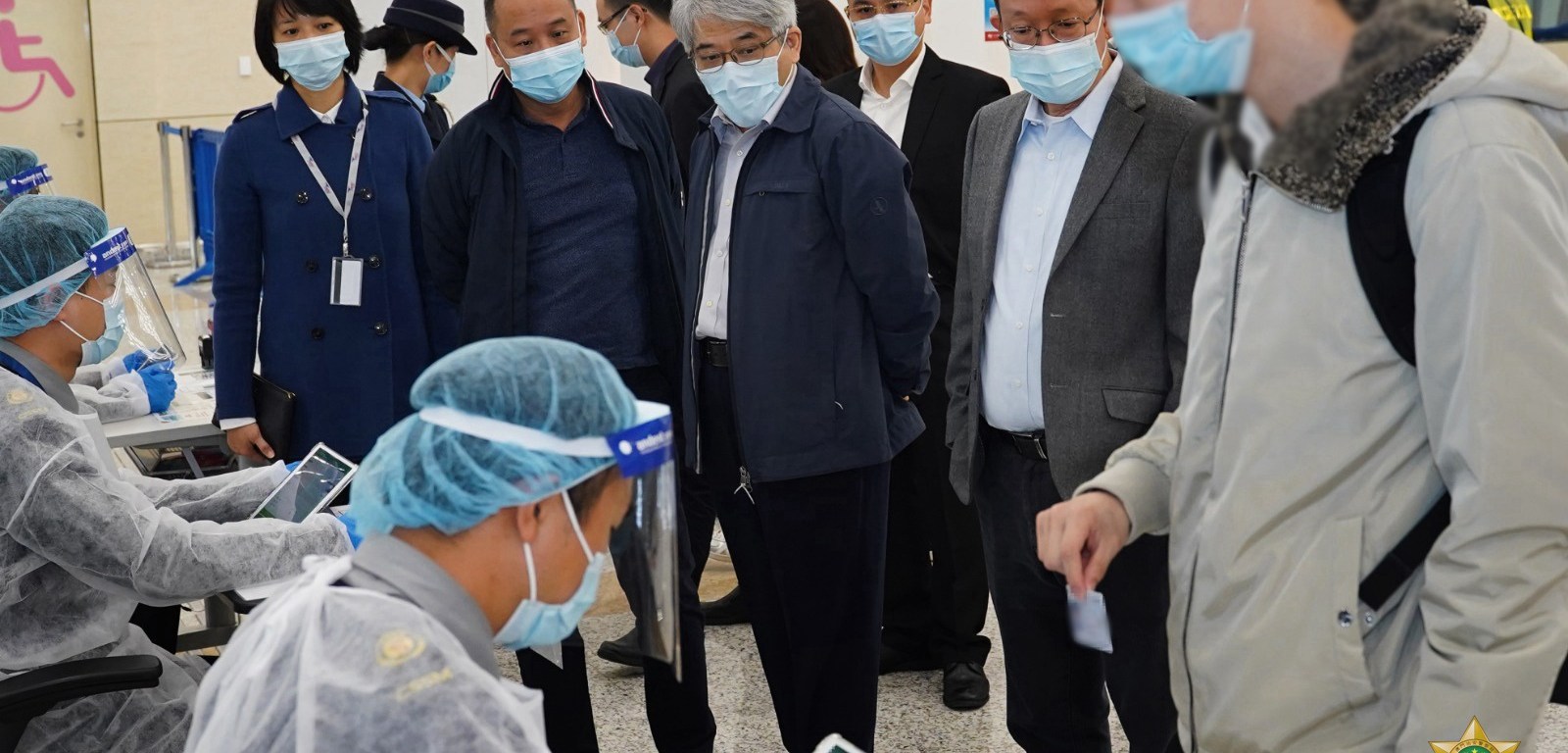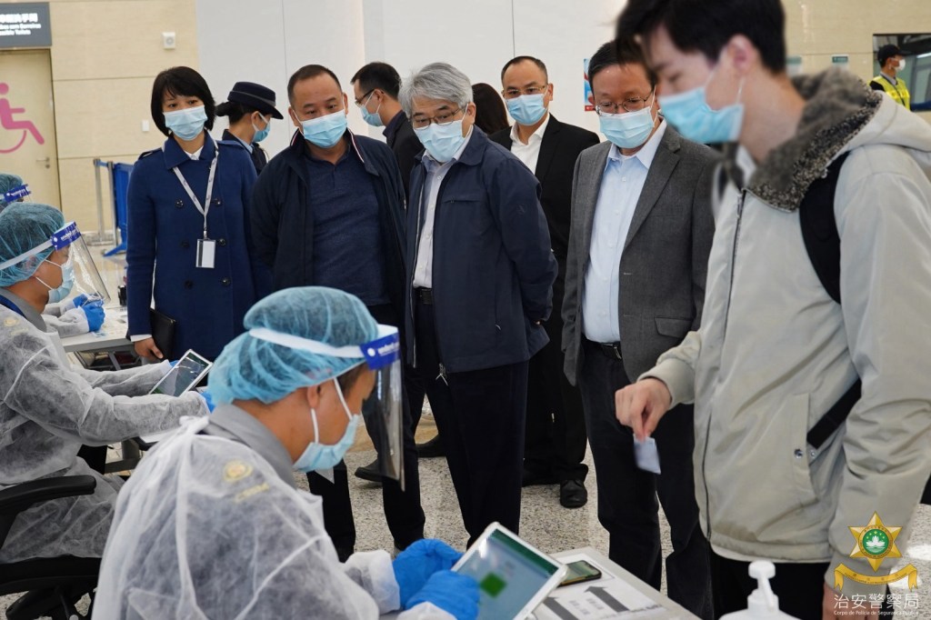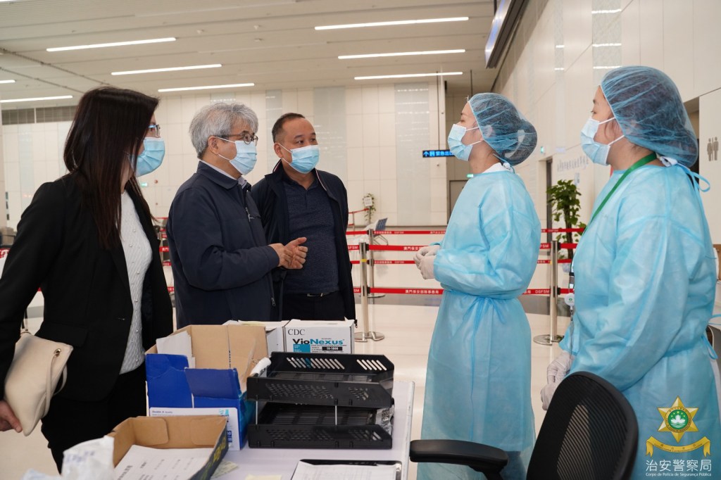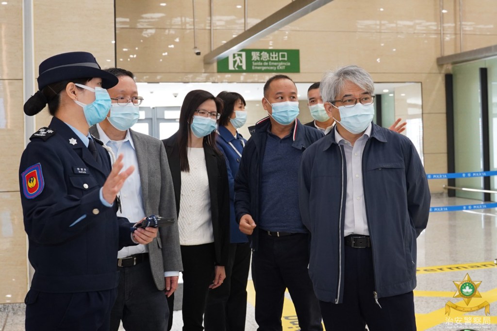 為進一步做好口岸通關及防疫措施,12月6日上午,衛生局李展潤局長、治安警察局吳錦華局長、相關官員及出入境事務主管,前往關閘、港珠澳大橋、澳門國際機場及橫琴口岸澳門口岸區,實地視察本澳各項出入境及防疫措施的落實情況,指示完善及優化有關工作,並感謝各位前線同事及鼓勵他們繼續堅守崗位,對疫情保持警惕,做好常態防控。