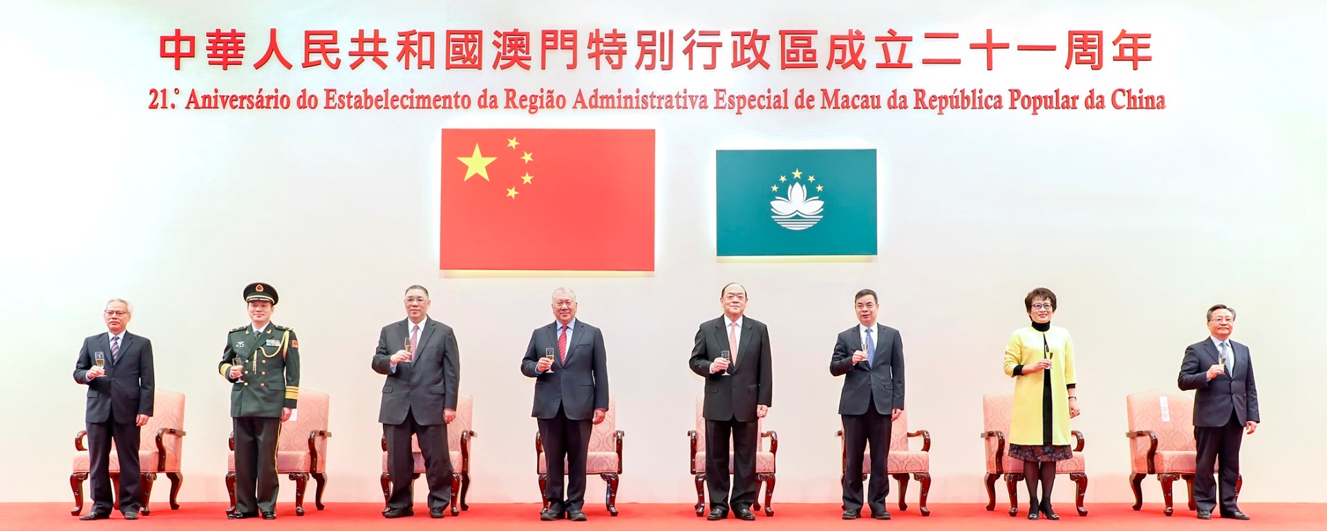 特區政府於12月20日舉行澳門特別行政區成立21周年慶祝酒會,行政長官賀一誠致辭時表示,期望各界繼續發揚愛國愛澳精神,團結一心,不斷推進具澳門特色的「一國兩制」實踐,爲實現中華民族偉大復興的中國夢,做出應有的貢獻。