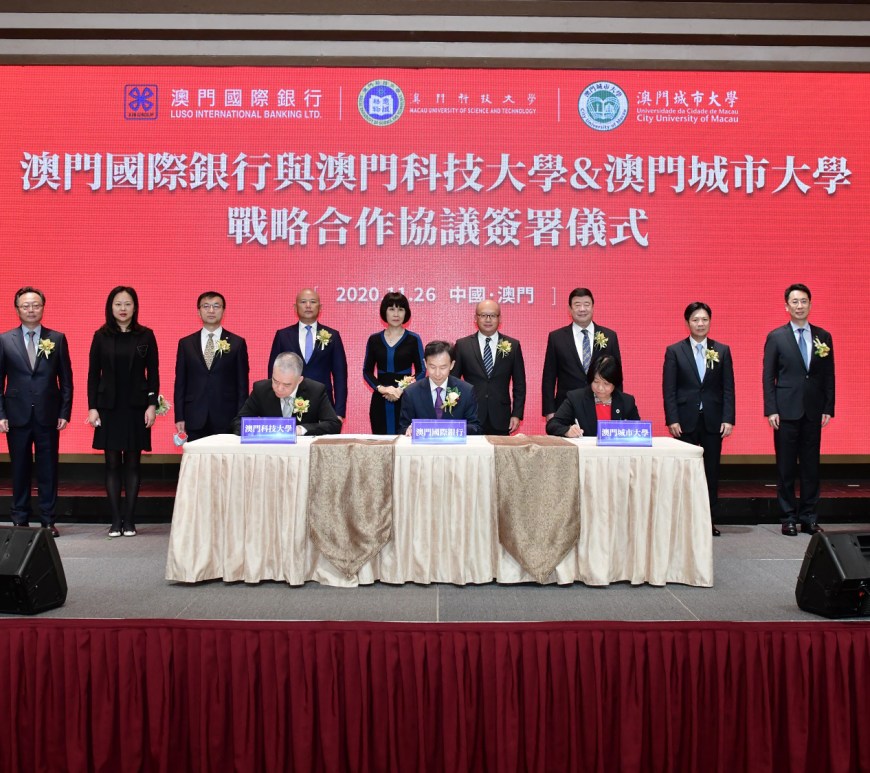 11月26日,澳門國際銀行與澳門科技大學、澳門城市大學在澳門旅遊塔舉行戰略合作協議簽署儀式。澳門高等教育局曾冠雄代局長,中聯辦經濟部朱宏副部長,全國政協常委、澳門科技大學校董會廖澤雲主席,全國政協委員、澳門城市大學校董會陳明金主席,澳門銀行公會葉兆佳主席,澳門中企協陳立新副理事長,廈門國際銀行王曉健董事長,澳門國際銀行焦雲迪總經理,澳門科技大學校董會陳季敏校董,澳門城市大學陳倩雯校董出席儀式並見證簽約,澳門國際銀行陳偉成副總經理與澳門城市大學孔繁清代校長及澳門科技大學唐家樂副校長代表銀校簽署合作協議。