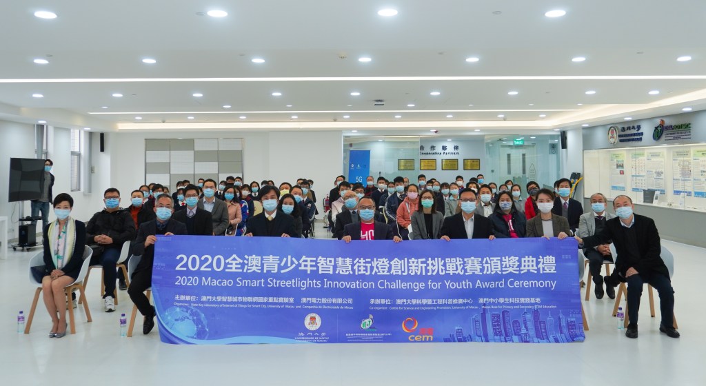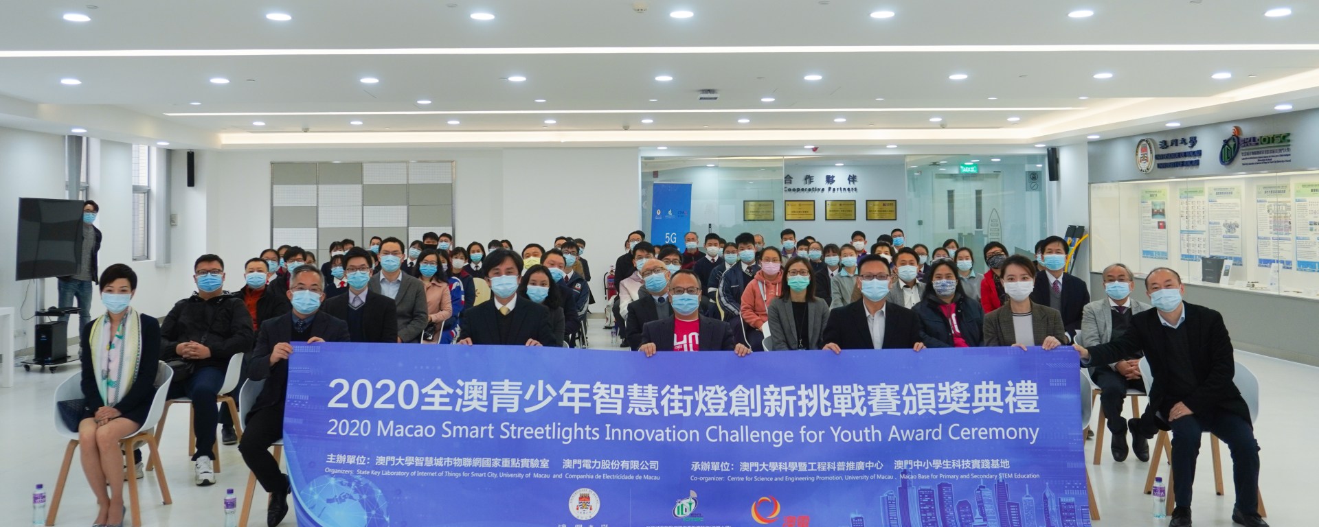「2020全澳青少年智慧街燈創新挑戰賽」頒獎典禮於1月17日上午9時30分在智慧城市物聯網國家重點實驗室5樓展廳順利舉行,由中央人民政府駐澳門特別行政區聯絡辦公室經濟部處長楊皓、教育暨青年局教育研究暨資源廳廳長黃健武、環境保護局能源業發展及管理廳高級技術員李鑄新、澳門科學技術發展基金活動輔助部高級經理謝偉明、澳門大學校長暨智慧城市物聯網國家重點實驗室主任宋永華及澳電執行委員會主席梁華權等嘉賓向得獎同學頒發獲獎證書。通過是次挑戰賽,將更好落實特區政府的「數字澳門」建設方案,加快佈局建設數字基礎設施。