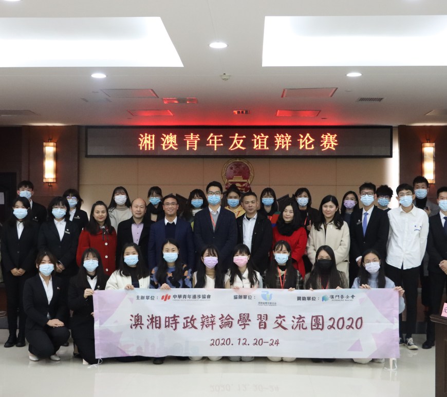 中華青年進步協會主辦,湖南省青年聯合會協辦,澳門基金會贊助的「澳湘時政辯論學習交流團2020」由青進會常務副理事長兼秘書長施逸任團長,帶領「全澳青年辯論公開賽2020——青年盃」獲勝辯手及指導老師,一行共二十人前往湖南長沙進行為期五天的學習交流。行程參觀了毛主席故居、湖南省博物館、馬欄山視頻文創產業園,並與中南林業科技大學進行辯論友誼賽。