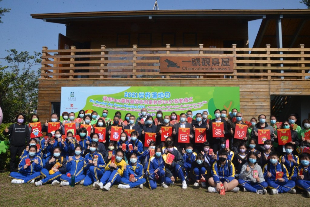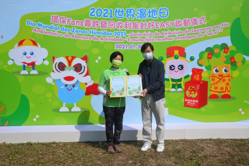 環境保護局為響應2月2日的世界濕地日,年1月30日在路氹城生態保護區舉行2021世界濕地日—環保Fans嘉許暨回收利是封好EASY啟動儀式。由環境保護局譚偉文局長及「環保Fun」之環保行為攞滿Fun活動的協辦單位澳門工會聯合總會張國然副會長,向協助路氹城生態保護區導賞表現出色的環保Fans進行嘉許。