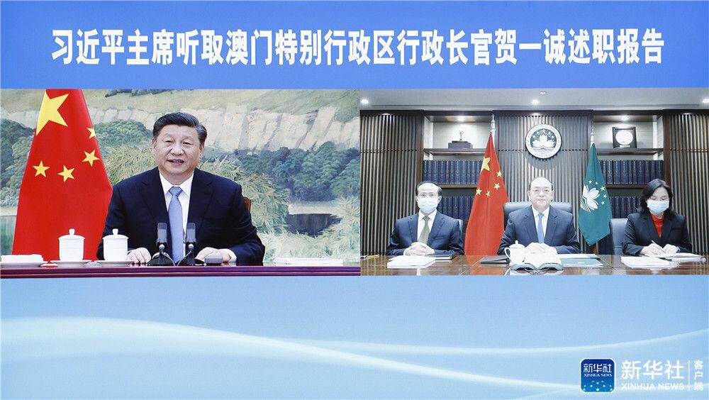 行政長官當天下午述職時,習近平主席說,因為疫情防控需要,所以採取視頻方式聽取行政長官對2020年工作的述職報告。習近平主席表示,2020年是行政長官和新一屆澳門特別行政區政府的開局之年,面對突如其來的新冠肺炎疫情,行政長官和特區政府快速反應、措施有力,在較短時間內控制住了疫情,至今已連續超過300天沒有本地新增確診病例,贏得了澳門市民和各有關方面的高度讚譽;在防控疫情的同時,特區政府採取有力措施恢復經濟、紓解民困,取得了積極成效,促進了澳門社會和諧,中央對行政長官和澳門特區政府的工作是充分肯定的。