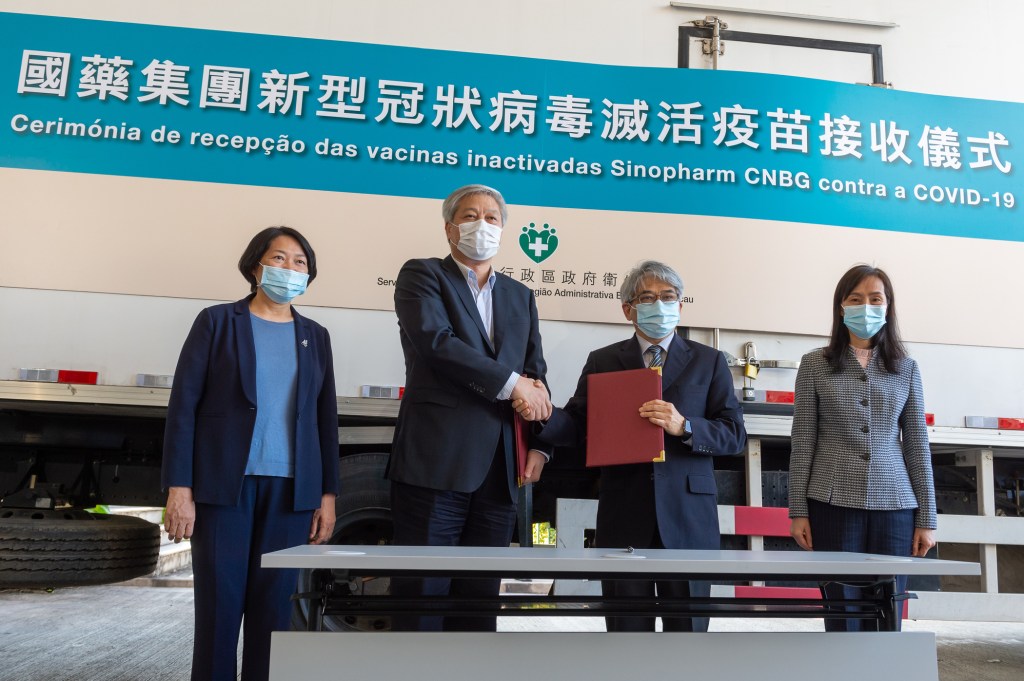 在中央政府大力支持下,首批10萬劑國藥集團中國生物集團北京生物制品研究所生產新型冠狀病毒滅活疫苗於2月6日運抵本澳,在社會文化司歐陽瑜司長、中央人民政府駐澳門特別行政區聯絡辦公室嚴植嬋副主任等見證下,衛生局於珠澳跨境工業區進行了疫苗入口檢查手續及接收儀式。