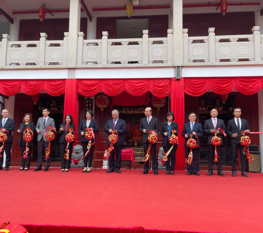 三月廿七日上午,澳門路環疊石塘山媽祖文化村天后宮旌旗招展、鑼鼓齊鳴,施琅將軍館落成揭幕剪綵儀式隆重舉行。全國政協副主席何厚鏵,澳門中聯辦副主任嚴植嬋,外交部駐澳門特派員公署特派員劉顯法,澳門社會文化司司長代表、司長辦公室主任何鈺珊,澳門文化局局長穆欣欣,澳門旅遊局代局長許耀明,澳門基金會行政委員會委員黎振強,澳門中華媽祖基金會主席代表顏奕真,全國政協委員、澳門中華媽祖基金會執行主席陳明金,全國人大代表、澳門立法會議員、澳門施氏宗親會永遠榮譽會長施家倫,澳門施氏宗親會會長施少峰等人出席主禮,澳門中華媽祖基金會董事兼秘書長吳聯盟主持儀式。澳門中華媽祖基金會董事兼天后宮管委會主任陳明確,澳門施氏宗親會理事長施明川、監事長施長利,以及兩會有關負責人、社會友好人士、澳門施氏宗親等逾400人,在做好防疫措施情況下參加活動。