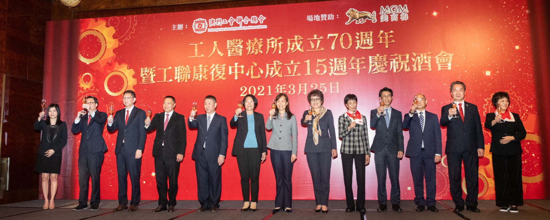 工聯工人醫療所成立七十周年暨工聯康復中心成立十五周年慶祝酒會日前假美高梅大宴會廳舉行,中聯辦副主任嚴植嬋,外交部駐澳副特派員王冬,中華全國總工會職工交流中心副秘書長常品超,社會文化司司長歐陽瑜,社工局局長韓衛,工聯總會會長何雪卿、理事長李從正等出席。