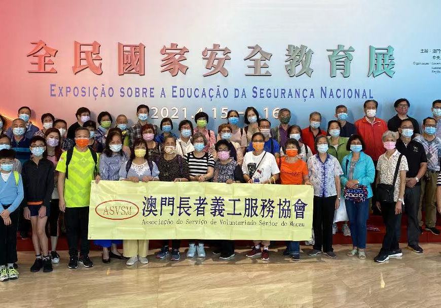 澳門長者義工服務協會是一個非牟利的團體,宗旨是向長者宣傳推廣健康生活訊息,提升長者自我照顧及生活素質;推動長者愛國愛澳精神。為履行宗旨,推動會員愛國精神,該會於2021年4月26日組織會員及友好團体一行50多人,前往中國與葡語國家商貿合作服務平台綜合體展覽廳,參觀了由澳門特別行政區政府與中央人民政府駐澳門特別行政區聯絡辦公室合辦的「全民國家安全教育展」。主辦單位向成員分別介紹了「百年未有之大變局下的國家安全」、「堅持總體國家安全觀 構建大安全格局」、「維護國家安全 確保『一國兩制』行穩致遠「和「國家安全 全民有責」各方面的情況。