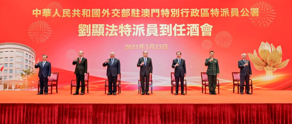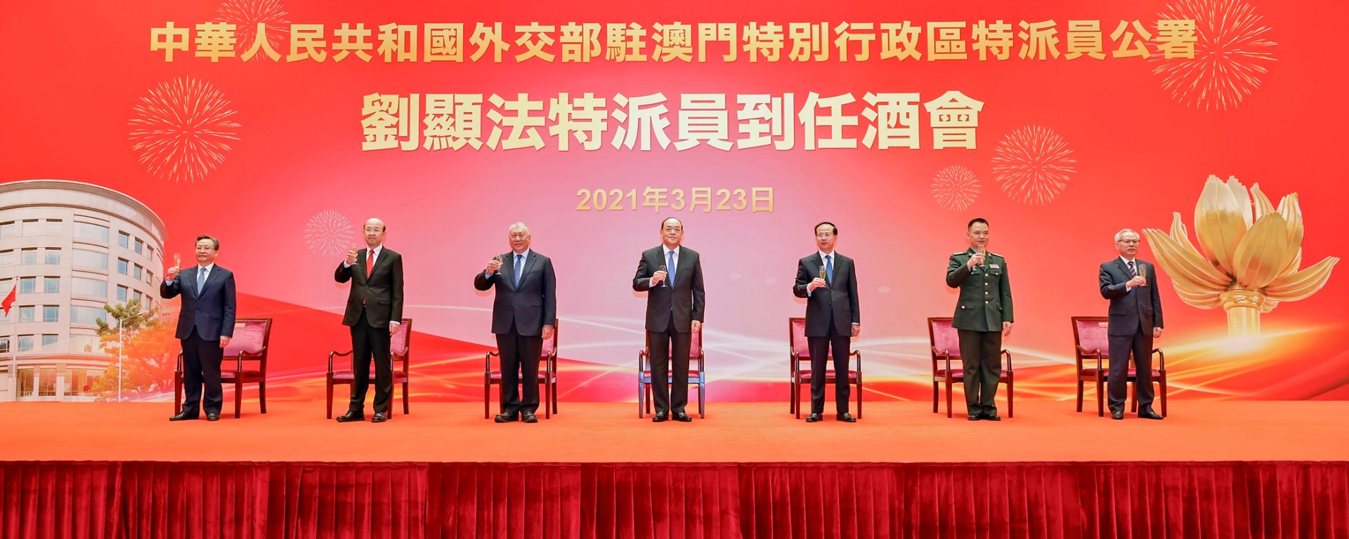 賀一誠行政長官在致辭中熱烈歡迎劉特派員來澳門履新,高度評價公署積極務實的涉澳外交工作為特區對外交往、經濟發展、澳門特色「一國兩制」偉大實踐和祖國外交事業所作貢獻,充分肯定外交公署對澳門防疫涉外工作給予的大力支持和協助,並強調將立足百年未有之大變局,按照「十四五」規劃綱要的要求,在中央政府支持和外交公署協助下,配合國家的外交政策,充分發揮「一國兩制」的制度優勢,積極利用國家外交資源,不斷提升澳門的對外交往工作,加快融入國家雙循環發展格局,加速「一中心、一平台、一基地」建設,共同推動澳門「一國兩制」偉大事業行穩致遠。