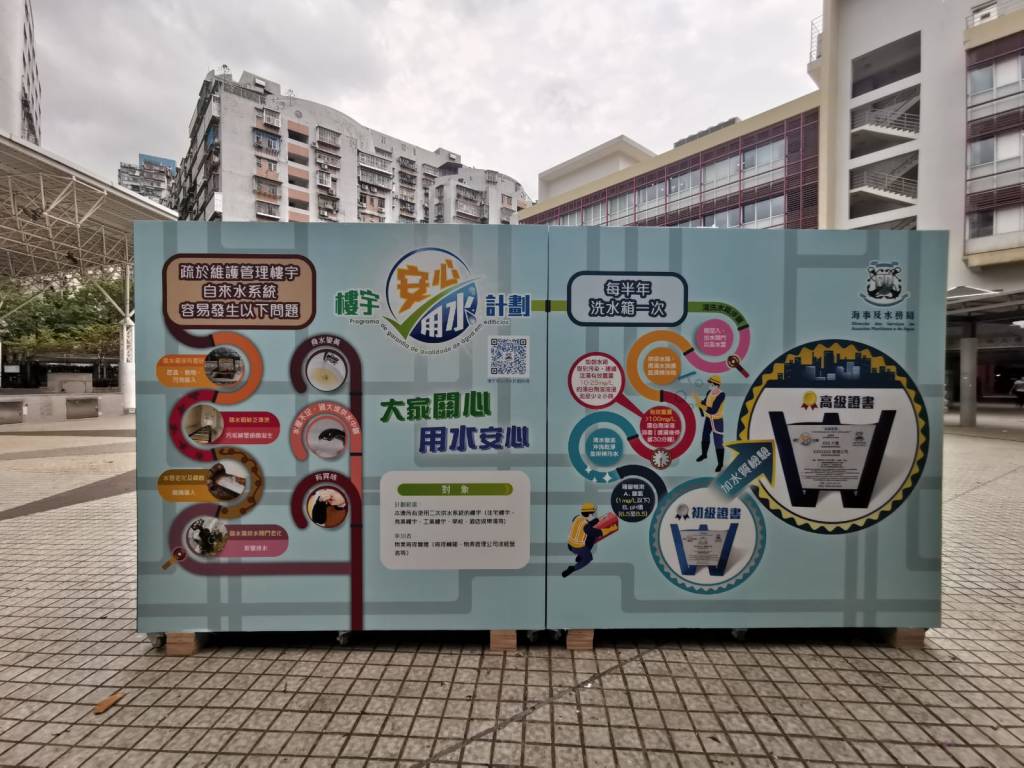 「樓宇安心用水計劃」旨在促進大廈業主及物業管理實體加強樓宇自來水系統的維護管理,目前共500棟大廈參加,約佔全澳高層樓宇的四成,其中獲高級證書的有280棟大廈,獲初級證書的有220棟大廈。參與計劃的樓宇只要按要求對內部自來水系統進行維護,包括每半年清洗水箱一次等,即可獲發初級證書;如在此基礎上進行水質檢驗且合格,更可獲發高級證書。計劃詳情及參與辦法可瀏覽當局網頁www.marine.gov.mo。