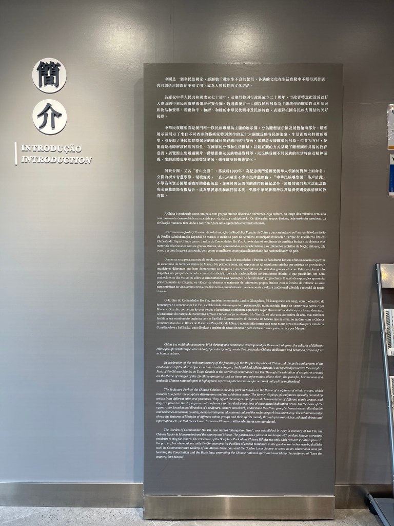 中華民族雕塑園原設於大潭山,為慶祝中華人民共和國成立七十周年及澳門回歸祖國二十周年,遷往何賢公園,透過圍繞五十六個以民族形象為主題創作的雕塑以及相關民族物品和資料,帶出和平、和諧、和睦的中華民族精神及民族特色,表達對祖國各民族大團結的美好祝願。