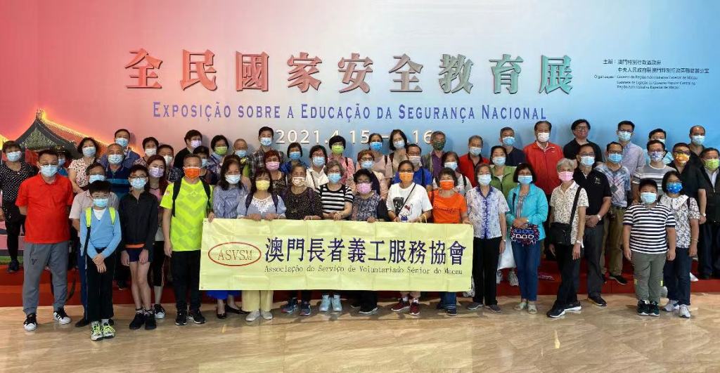 澳門長者義工服務協會是一個非牟利的團體,宗旨是向長者宣傳推廣健康生活訊息,提升長者自我照顧及生活素質;推動長者愛國愛澳精神。為履行宗旨,推動會員愛國精神,該會於2021年4月26日組織會員及友好團体一行50多人,前往中國與葡語國家商貿合作服務平台綜合體展覽廳,參觀了由澳門特別行政區政府與中央人民政府駐澳門特別行政區聯絡辦公室合辦的「全民國家安全教育展」。主辦單位向成員分別介紹了「百年未有之大變局下的國家安全」、「堅持總體國家安全觀 構建大安全格局」、「維護國家安全 確保『一國兩制』行穩致遠「和「國家安全 全民有責」各方面的情況。