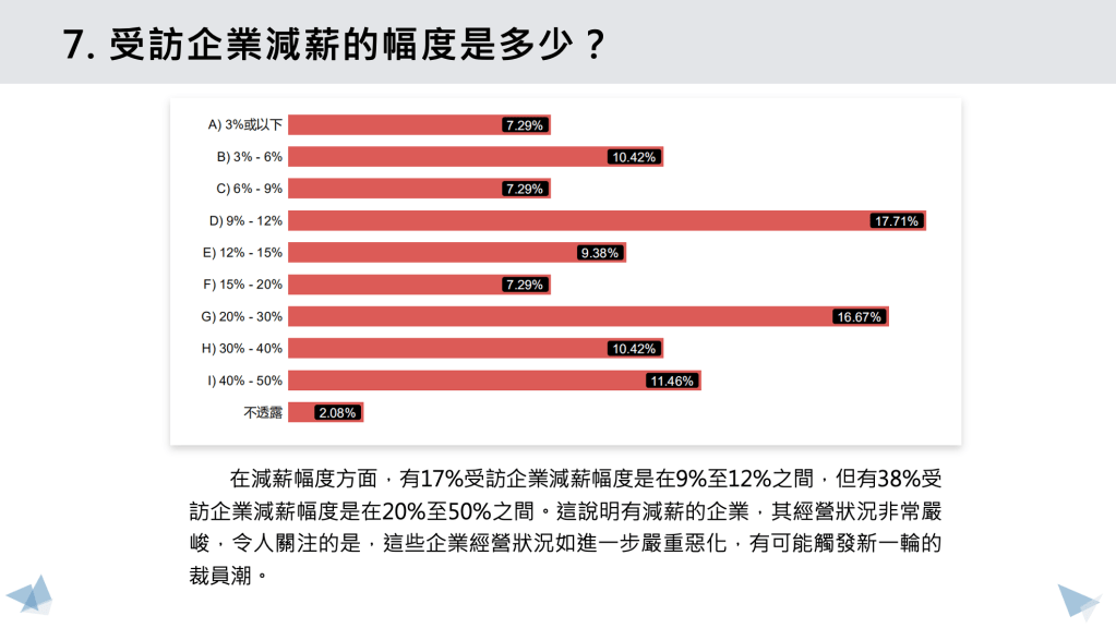 調查結果反映,受訪中小企業七成半沒有裁減人手,百分之七需要增加人手,一成八減少人手。調查又發現,受訪企業一成九存在薪酬變動,其中減薪有百分之八點一,而加薪為一成一。減薪幅度方面,受訪企業一成七介乎百分之九至十二,更有三成八介乎二至五成。可見有減薪的企業,經營狀況非常嚴峻,如進一步惡化,有可能觸發新一輪裁員潮,實在令人關注。而有加薪的企業,約七成介乎百分之三至六。至於福利方面,受訪企業逾八成七有給予僱員法定有薪年假,繼而為房屋津貼、佣金、年終花紅、年尾雙糧等,僅得百分之一點二向僱員發放進修或培訓津貼。