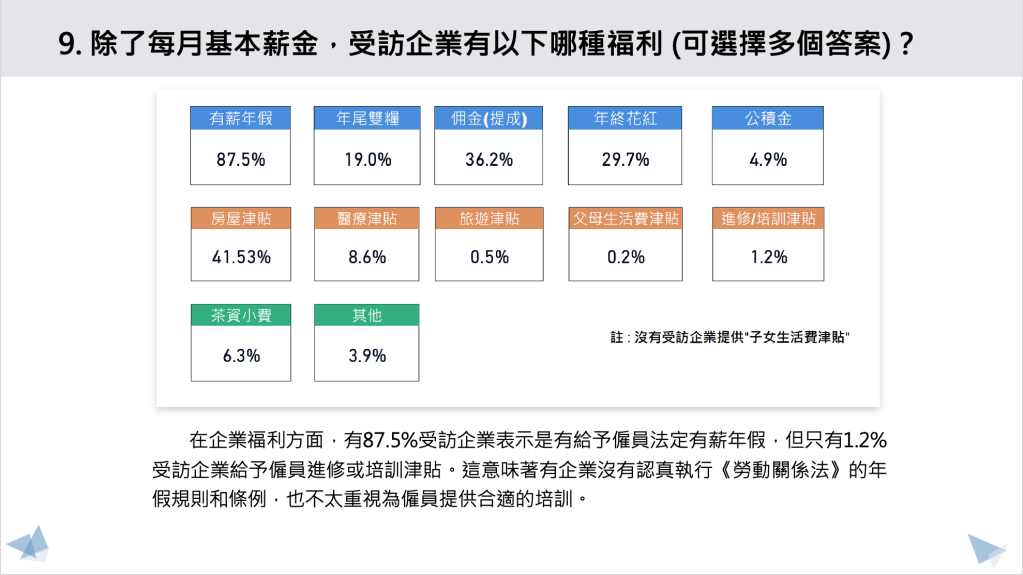 問卷調查顯示,逾一成二企業未有提供僱員法定六天有薪年假。根據《勞動關係法》規定,「年假在到期的曆年內享受,但經僱主與僱員雙方協議後,最多可累積兩年」,不排除企業會安排僱員在兩年之內補回有薪年假。該會亦期望政府加強宣傳推廣《勞動關係法》內容,令僱主及僱員都清楚自身權利及義務。