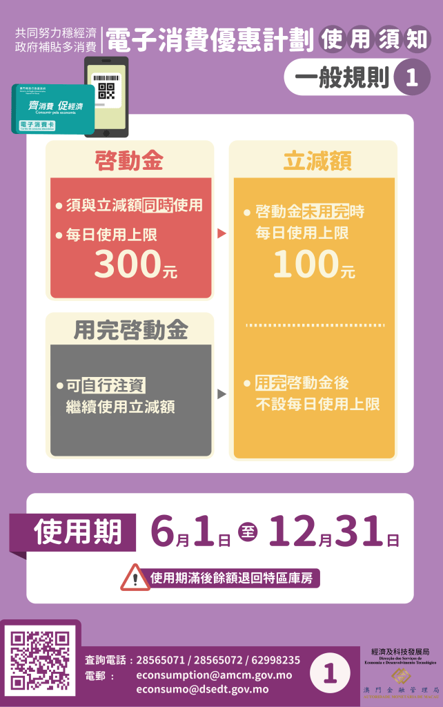 特區政府推出「2021保就業、穩經濟、顧民生計劃」,當中的「電子消費優惠計劃」紓民困、穩經濟。已成功領取電子消費優惠的居民,可自6月1日起,使用5,000元啟動金及3,000元立減額的組合優惠,使用期至本年12月31日,為期7個月。經濟及科技發展局和金融管理局持續廣泛宣傳,針對6月開始的優惠使用,已製作簡明易懂的視頻及圖文包,結合一般規則及具體例子進行介紹,資訊性及趣味性兼備。
