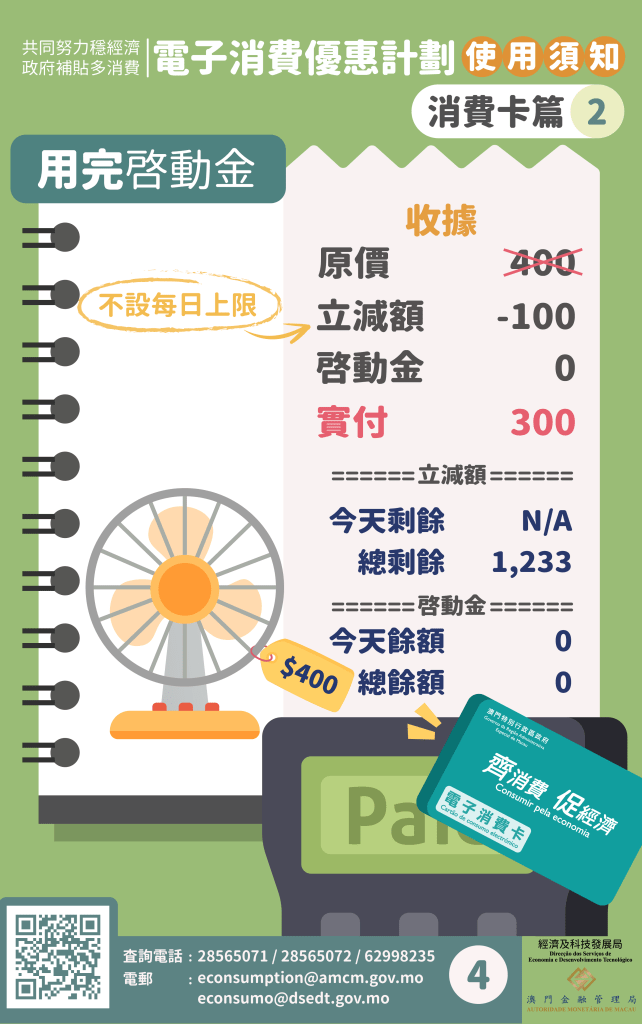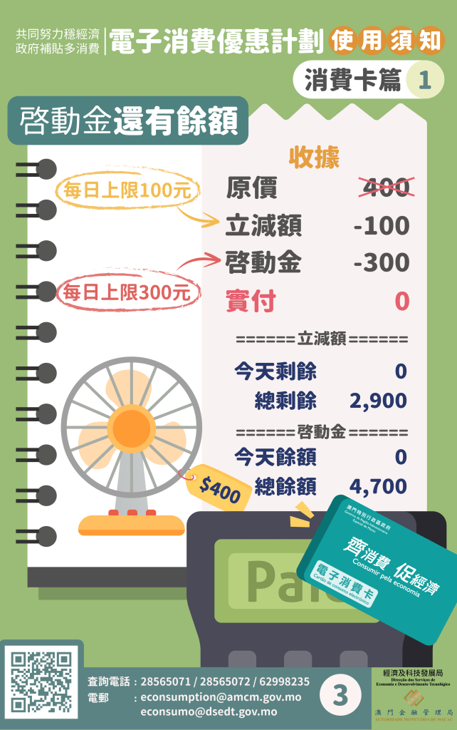 如選擇透過「消費卡」領取優惠,每次使用優惠付款後,支付機具都會出具收據(小票),居民可以於收據上查看啟動金及立減額的當天餘額及總餘額。此外,亦可通過計劃專題網站(https://www.dsedt.gov.mo/2021consumo) 查詢餘額。