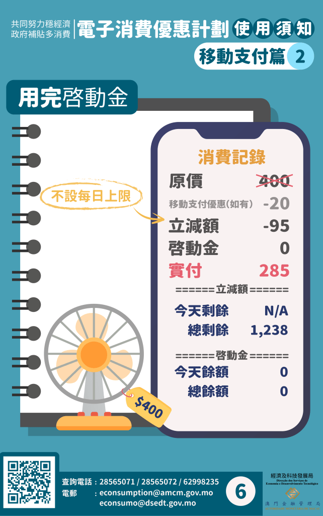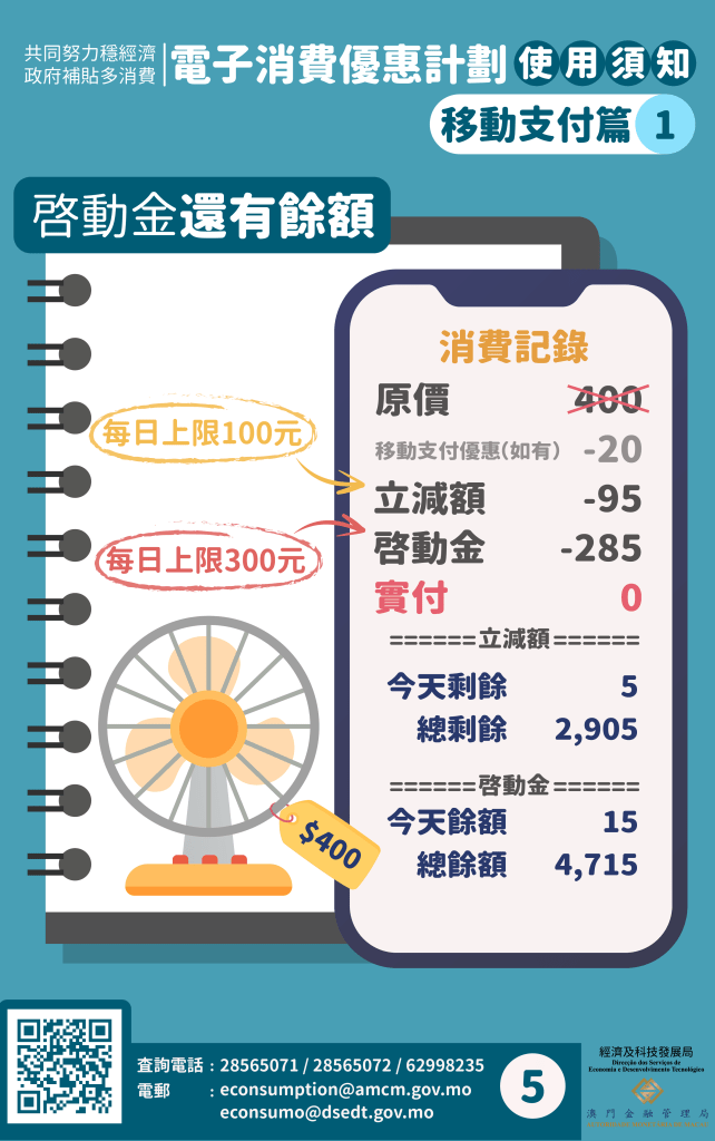 居民可於手機程式的交易紀錄中查看各項扣減的明細。同時,也可於程式內查詢啟動金及立減額的當天餘額和總餘額,以及過去交易詳情。居民如有疑問,可瀏覽計劃專頁,亦歡迎在辦公時間向經科局或金管局查詢。