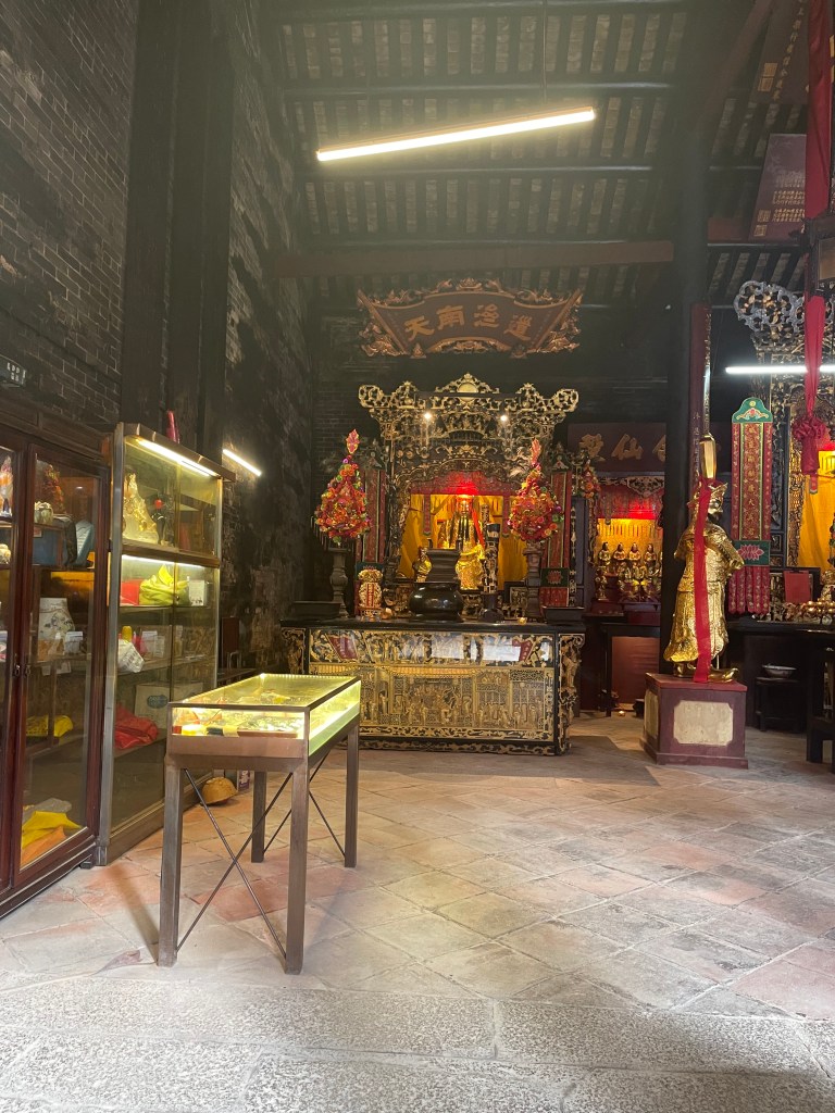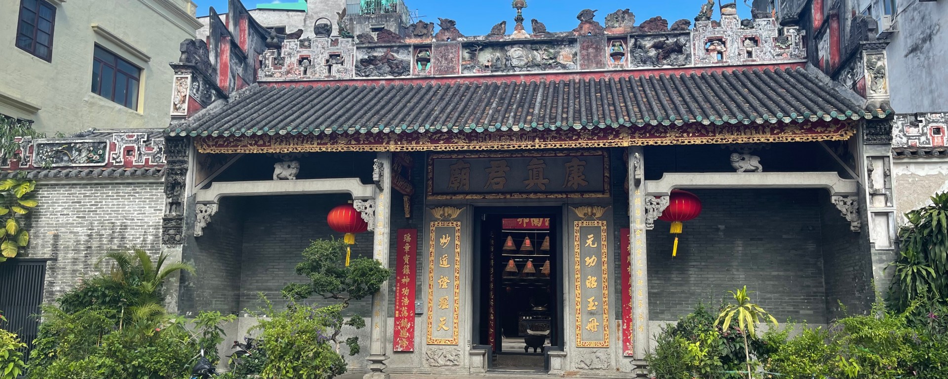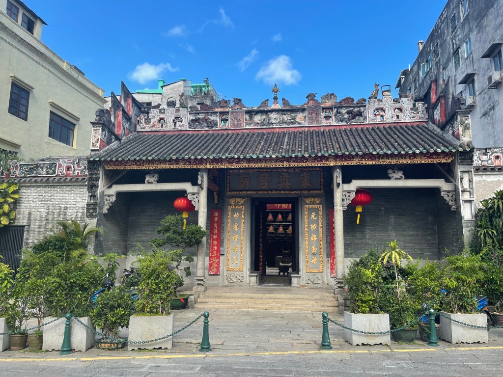 位於十月初五街的康真君廟始建於1860年,相傳有人於附近海傍拾獲康公神像一尊,故建廟供奉。甫入廟門可以見到首先供奉的是花粉夫人,進入正殿供奉康聖真君,左為南海廣利洪聖大王,右為西山金聖候王。偏殿則前後供奉六祖聖佛及華佗先師。在專主民間喜慶法事殿前中央放置的「酒船石」,於清咸豐年間雕刻而成。並有船隻、鯉躍龍門、龍鳳呈祥及松鶴延年吉祥圖案,該石專給善男信女向神佛禮拜奠酒之用,因而得名。