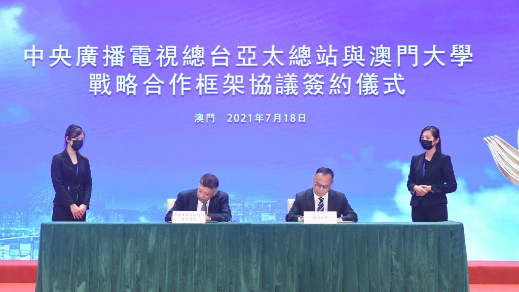 活動現場,總台亞太總站與澳門大學簽署了《戰略合作框架協定》。雙方將把總台在新聞報導、視音訊資源和多元傳播等方面的媒體優勢,與澳門大學在人才培養、傳播科研和國際智庫等方面的高校特色有機融合,共同打造總台與澳門合作共贏的新標杆,為廣大學子實踐鍛煉、成長成才提供更加廣闊的舞台。