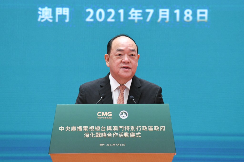 賀一誠首先衷心感謝中央廣播電視總台一直以來對澳門的大力支持,並對各項簽署活動成功舉辦表示熱烈祝賀。他表示,本次舉行的各項活動正是澳門與中央廣播電視總台簽署的深化戰略合作框架協議的有效落實,標誌著雙方合作的進一步深化,也使澳門居民更加深刻感受到中央的關心和支持。奧運賽事授權轉播落地澳門,廣大澳門居民能夠盡情欣賞精彩的奧運賽事,感受各國運動健兒永不言敗的頑強意志,這種精神在當前團結抗擊新冠疫情、恢復經濟社會發展中更顯彌足珍貴。