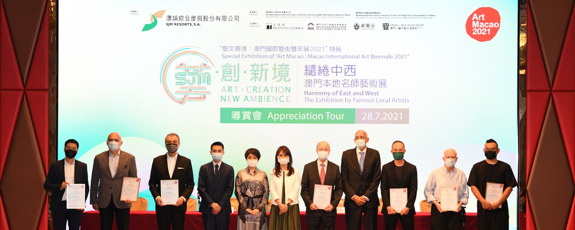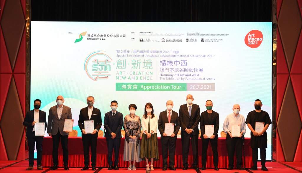 由澳娛綜合度假股份有限公司呈獻的「藝‧創‧新境」展覽系列近日揭幕,積極響應「藝文薈澳:澳門國際藝術雙年展2021」。澳娛綜合為「繾綣中西 — 澳門本地名師藝術展」舉辦首場導賞會,邀請澳門著名藝術家親自介紹一系列專門為上葡京綜合度假村特別創作的藝術品,並分享背後的創作理念。澳娛綜合董事局主席何超鳳女士在活動上向各參展藝術家頒發感謝證書,包括:蘇樹輝博士、馬若龍先生、吳衛鳴先生、君士坦丁先生、馬維斯先生、霍凱盛先生及蔡國傑先生。
