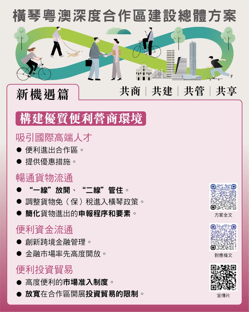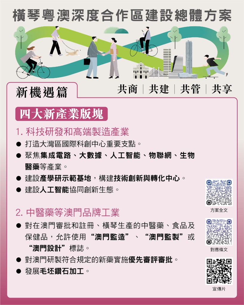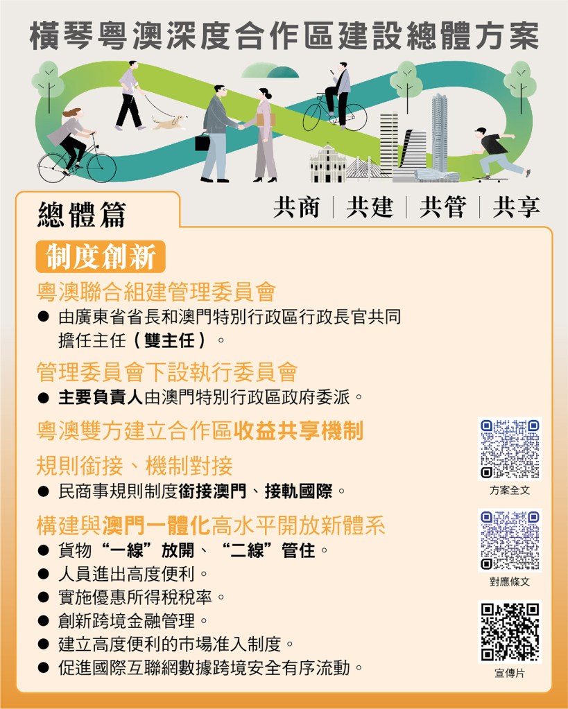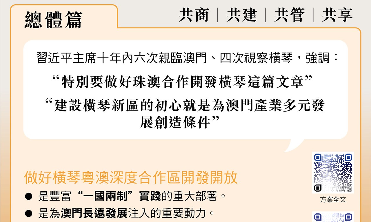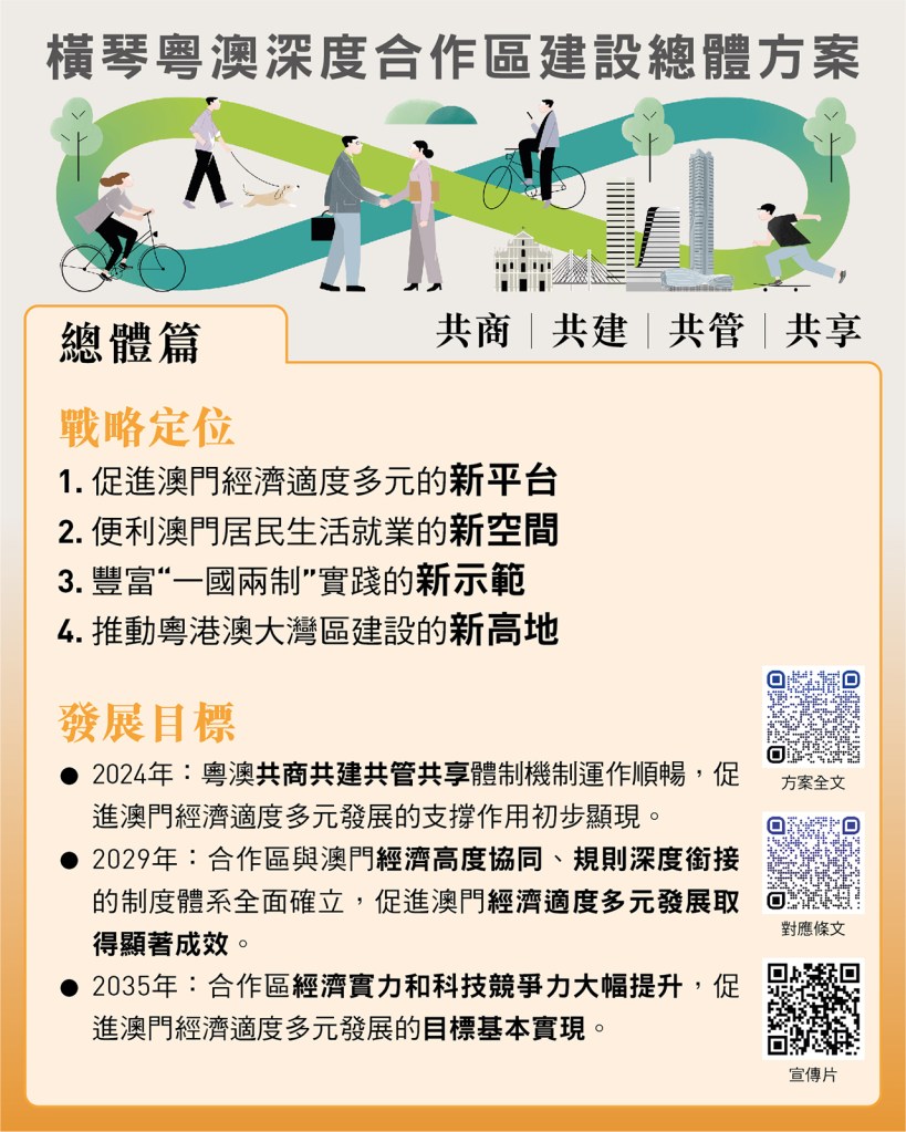《橫琴粵澳深度合作區建設總體方案》明確了合作區「一條主線」、「四個戰略定位」、「四項主要任務」,橫琴開發進入粵澳全面合作共商共建共管共享的新階段。