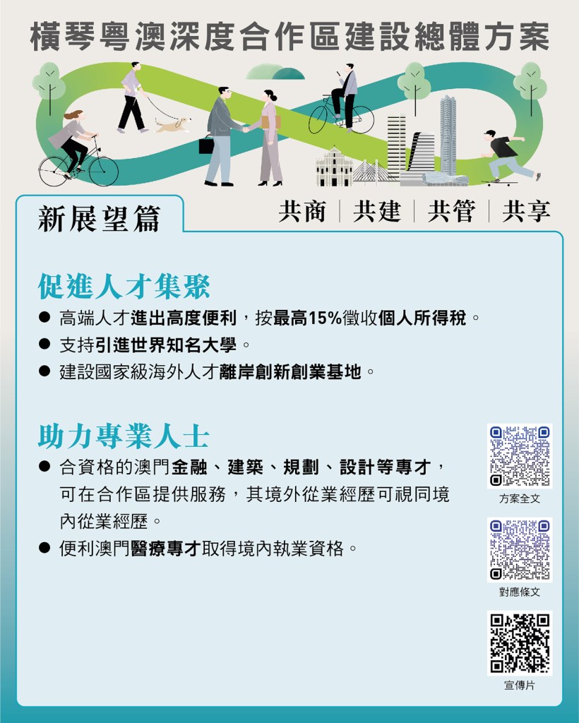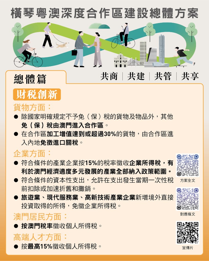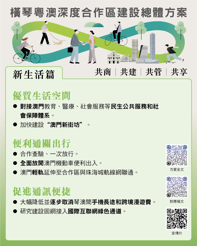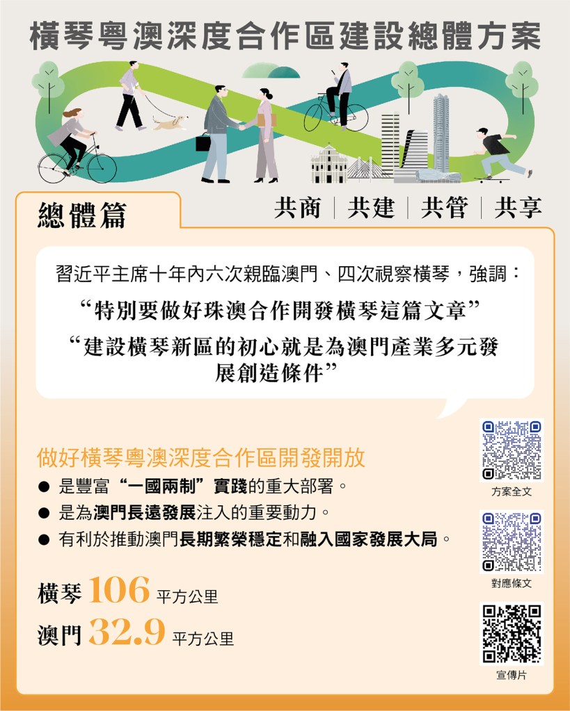 中央政府於9月5日公佈的《橫琴粵澳深度合作區建設總體方案》,是中央政府支持澳門經濟適度多元發展、豐富「一國兩制」實踐的重大部署,為澳門長遠發展注入新動力,特區政府對總體方案的出台表示熱烈歡迎和衷心感謝,將積極把握總體方案為澳門締造的良好機遇,為謀劃特區長遠發展注入新動力。
