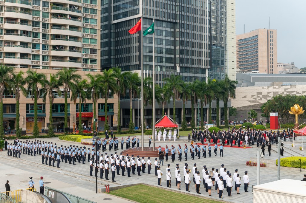 酒會前,特區政府於早上8時在金蓮花廣場舉行隆重的國慶日升旗儀式,行政長官、中央人民政府駐澳機構負責人、澳門特區立法及司法機關負責人、行政會委員、立法議員、特區政府官員、澳區人大代表、政協委員等約100人出席。