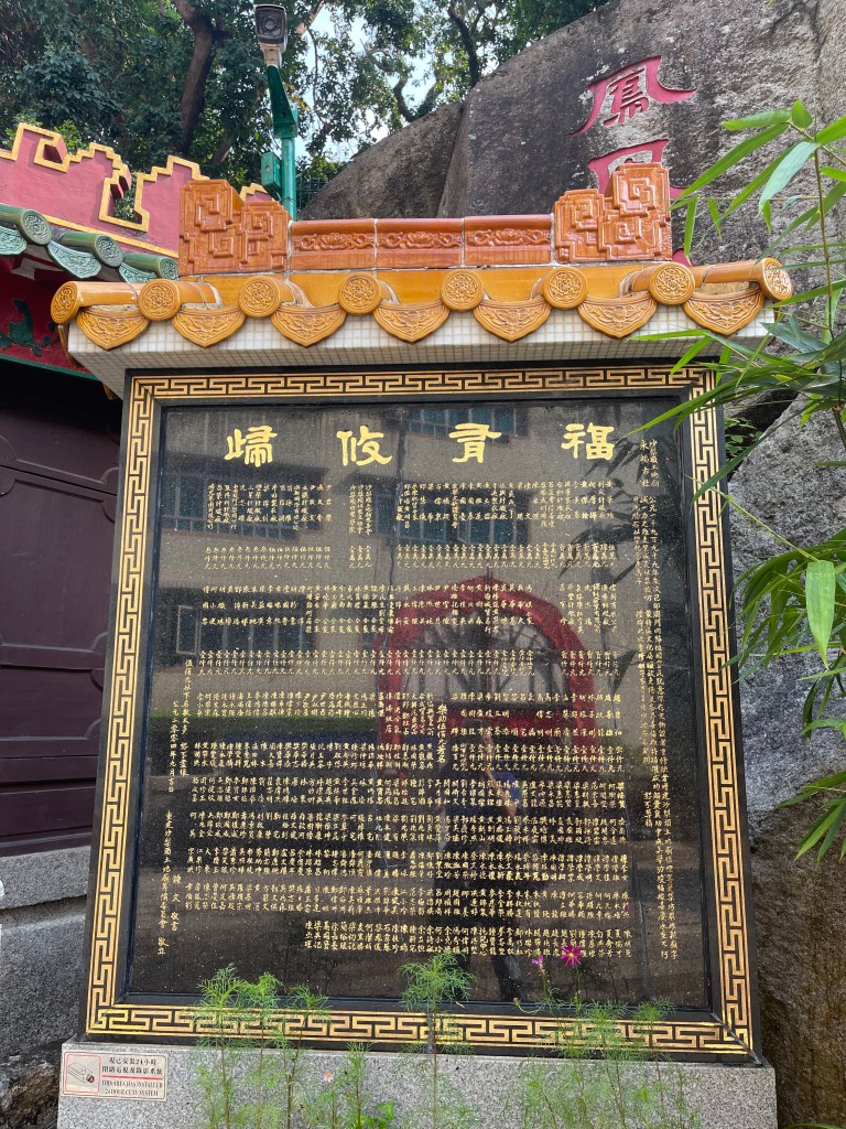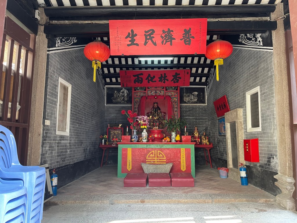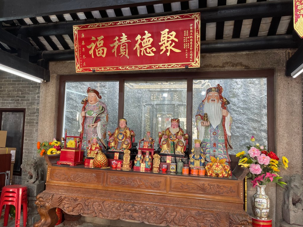 觀音巖左右兩旁的分別是土地殿及醫靈殿。土地殿,又名永福古社,在這廟宇群落中歷史最悠久,為一歇山式飛簷建築,其主要特點是一拜亭(永福亭)建築緊貼在主殿前,形成主殿的前庭。永福古社屋脊上採用精緻的石灣琉璃彩塑,裝飾甚為華美。殿堂內供奉土地公公及土地婆婆,從正後方的玻璃窗望外,可見外面依山石鑿成的神龕,也題為「永福古社」,那是土地廟的最初面貌,後來才在神龕的基礎上建廟堂的。