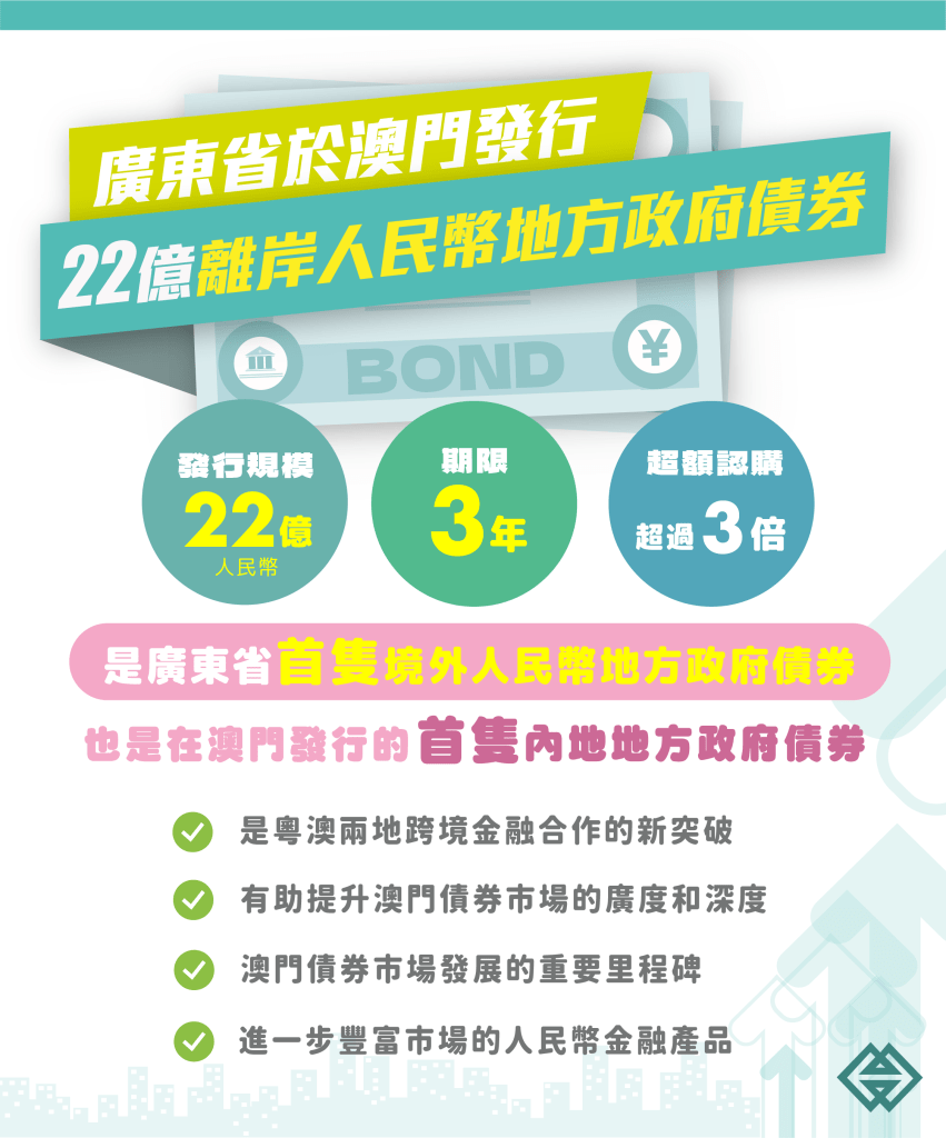 今年是國家「十四五」規劃的開局之年,在粵港澳大灣區融合發展的背景下,廣東省在澳門發行離岸人民幣地方政府債券,是粵澳兩地跨境金融合作的新突破,也是繼2019年國家財政部首次在澳門發行國債後,澳門債券市場發展的另一個重要里程碑。本次發行將有助提升澳門債券市場的廣度和深度,為澳門債券市場的穩步發展奠下更穩固的基礎,也將進一步豐富澳門離岸市場的人民幣金融產品,促進人民幣國際化。