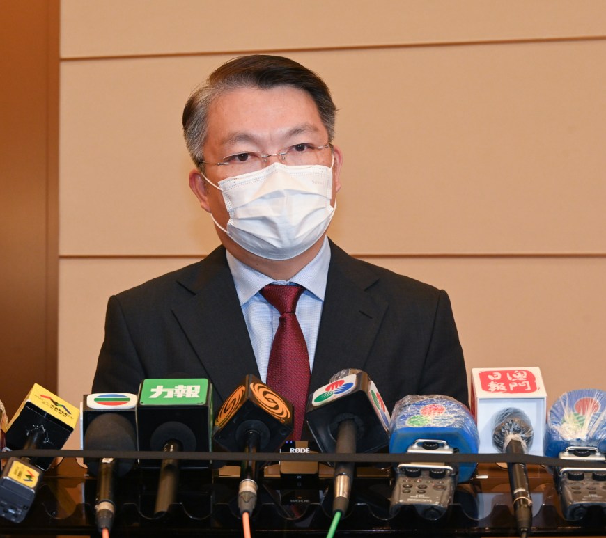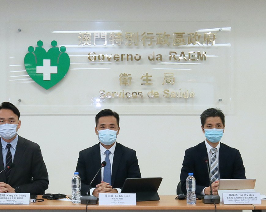 新型冠狀病毒感染應變協調中心日前舉行記者會,衛生局羅奕龍局長、教育及青年發展局龔志明副局長、仁伯爵綜合醫院戴華浩醫務主任、警察總局警務聯絡及公共關係處張健欣處長、旅遊局公共關係處藍同好處長、治安警察局行動及通訊處馬超雄處長、疾病預防控制中心傳染病防制暨疾病監測部梁亦好協調員共同會見傳媒。