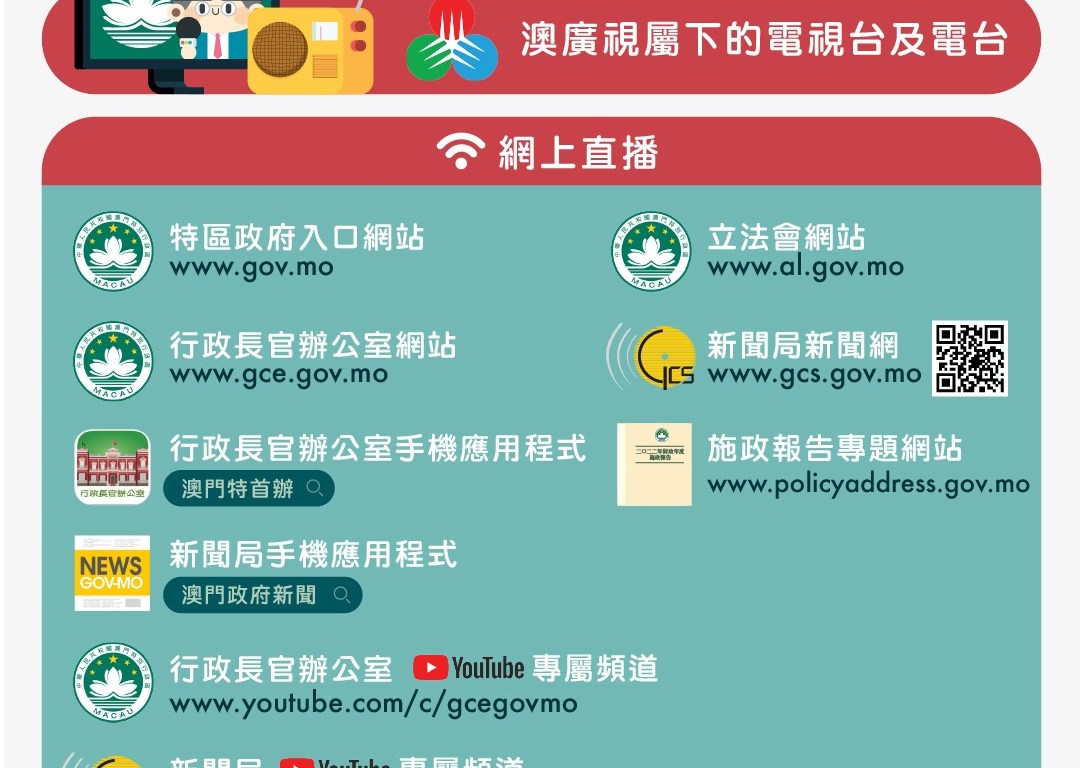 澳廣視屬下電視台及電台屆時將會現場直播。公眾亦可透過澳門特別行政區政府入口網站、行政長官辦公室、立法會和新聞局的網站,行政長官辦公室和新聞局的手機應用程式及專屬Youtube頻道,以及新聞局Facebook專頁,觀看網上直播。