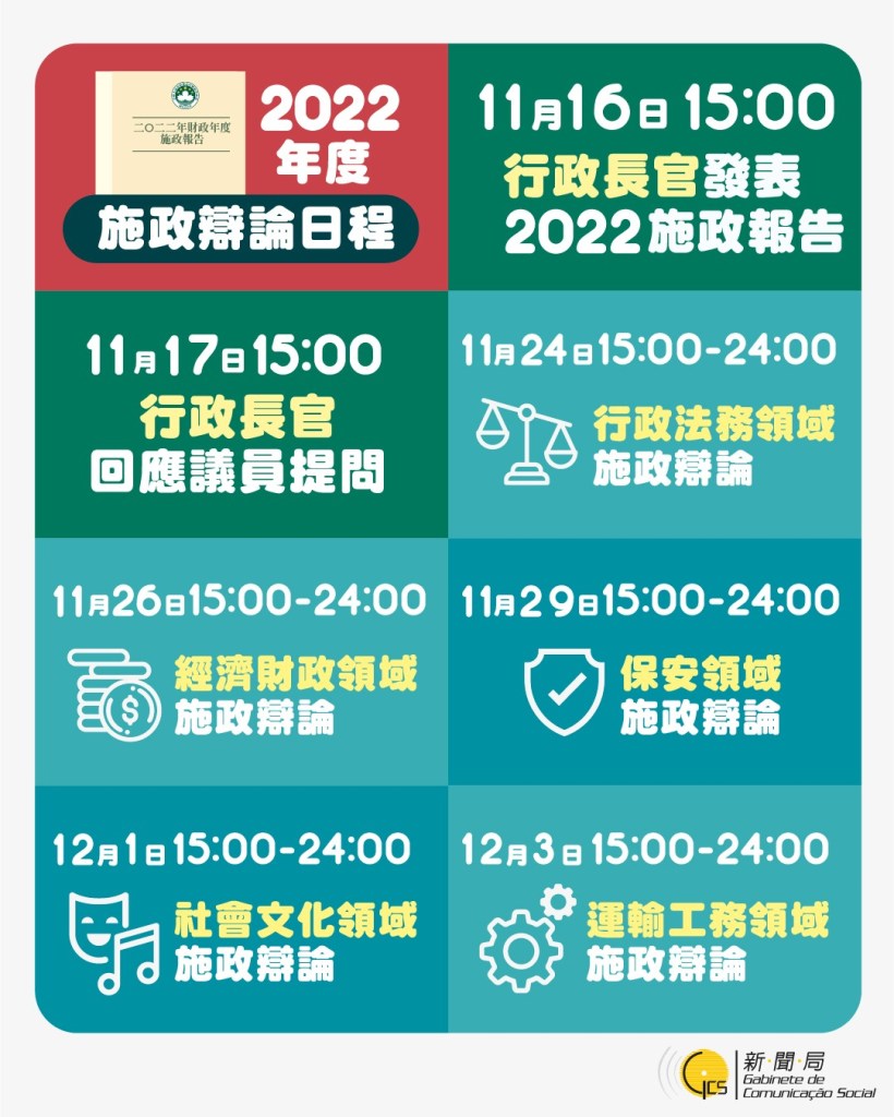 行政長官賀一誠將於11月16日下午3時在立法會發表《2022年財政年度施政報告》,並於同日下午5時在政府總部舉行新聞發佈會,就施政報告內容回答記者提問。行政長官其後將於11月17日下午3時列席立法會全體會議,回應議員關於2022年度施政報告的提問。