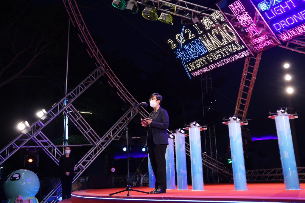 文綺華致辭時提到,澳門光影節已是第七年舉行,廣受居民和旅客歡迎,而「翱遊澳門無人機表演盛會」是旅遊局首次舉辦的盛事,期望發揮盛事疊加效應,吸引更多居民和旅客到不同的社區遊覽及消費,豐富旅遊體驗,助力深化「旅遊+文創」跨界融合,同時惠及區內商戶,促進夜間及社區經濟。