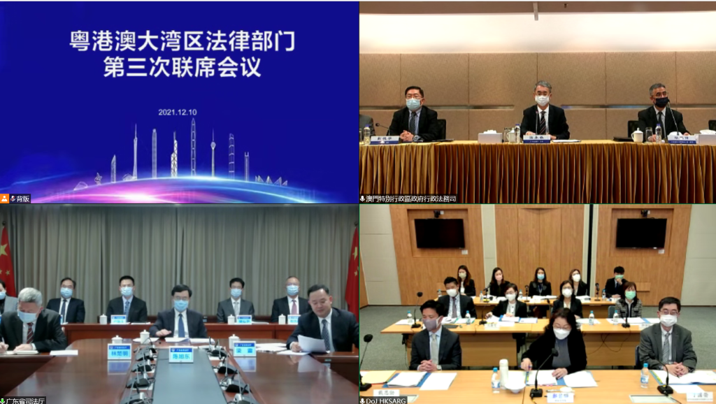 澳門行政法務司、香港律政司及廣東省司法廳於12月10日以視像方式舉行粵港澳大灣區法律部門第三次聯席會議,由廣東省司法廳主持。會議通過了《粵港澳大灣區調解員資格資歷評審標準》及《粵港澳大灣區調解員專業操守最佳準則》,並就加強大灣區的調解、仲裁合作以及共同開展法律培訓等問題進行深入討論。
