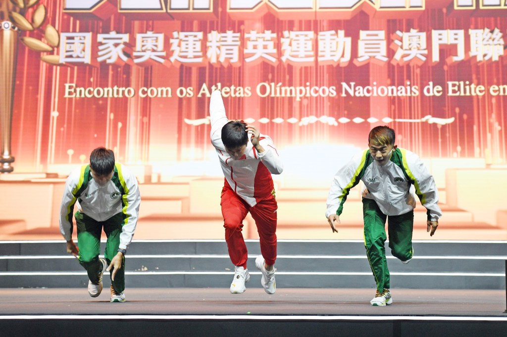 代表團一行晚上7時15分出席了在澳門東亞運動會體育館舉行的「我們的驕傲-國家奧運精英運動員澳門聯歡會」,現場有歌舞表演及遊戲,約4,000名觀眾除了一睹精英運動員的風采外,更與運動員近距離接觸和互動,現場氣氛熱鬧。