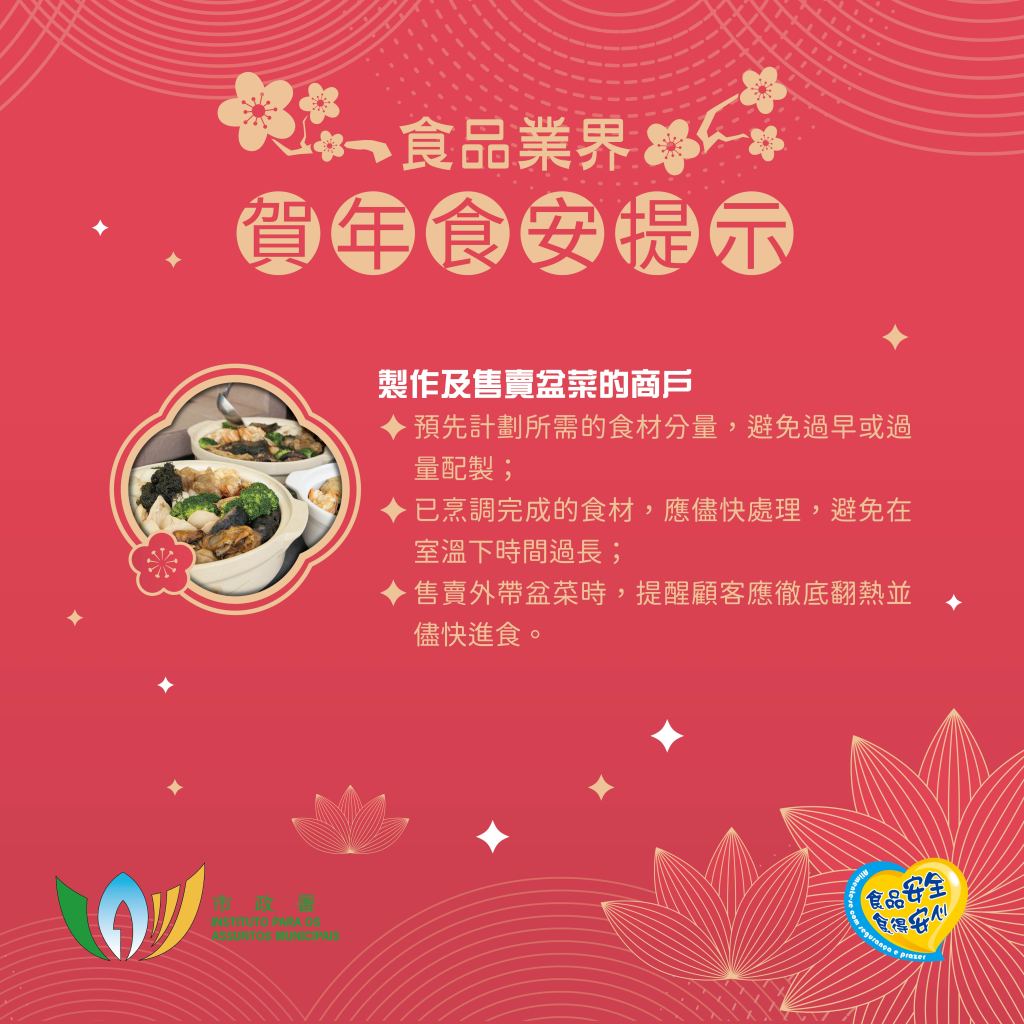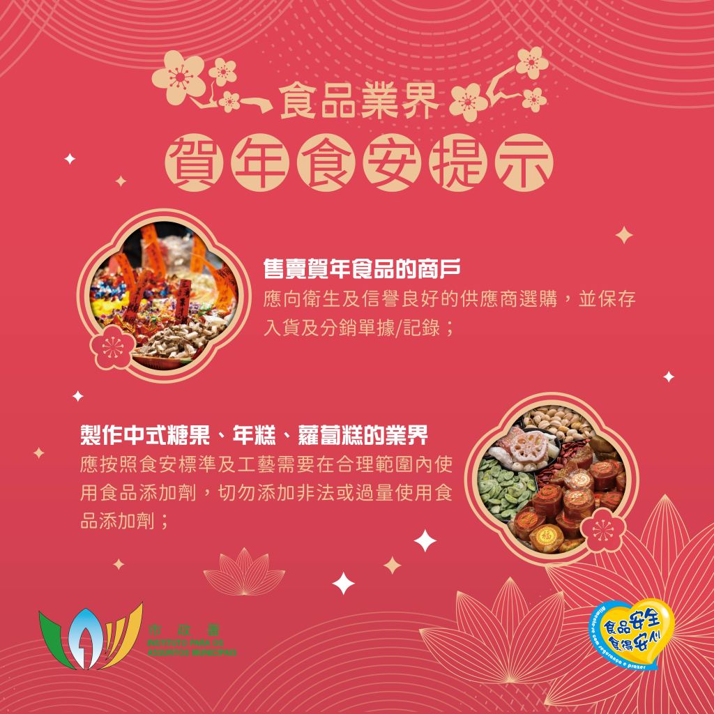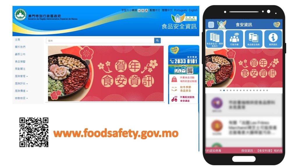 市政署亦已於食品安全資訊網www.foodsafety.gov.mo及食安資訊手機應用程式開設「賀年食安資訊」專頁,歡迎業界及市民查閱相關食安操作指引及資訊。