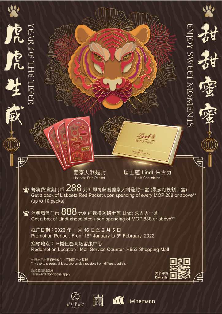 H捌伍叄商場與賓客甜蜜度虎年,商場內放置了各式各樣有別傳統的精緻裝飾讓賓客打卡拍照,以幻彩色調及花朵元素,配合場內現代風格,以不一樣的設計,寓意來年花開富貴,如意吉祥。現凡於H捌伍叄商場內消費滿澳門幣288元,即可獲贈葡京人獨家設計利是封一盒,消費滿澳門幣888元可獲贈瑞士蓮Lindt 朱古力一盒,暖暖心意,滿滿甜蜜。