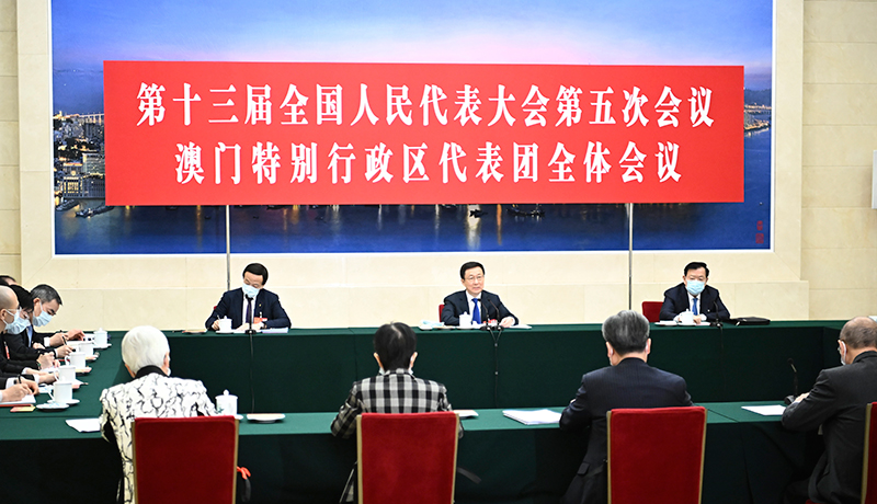 在認真聽取澳門地區全國人大代表發言後,韓正表示,過去一年,在以習近平同志為核心的黨中央堅強領導下,全國上下共同努力,如期打贏脫貧攻堅戰,如期全面建成小康社會,實現了「十四五」良好開局,我國發展又取得新的重大成就。在中央的大力支持下,在特區行政長官和特區政府帶領下,香港、澳門積極防疫情、穩經濟、保民生,保持了社會大局穩定。近年來,香港、澳門維護國家安全的法律制度和執行機制更加健全,選舉制度更加完善,「愛國者治港」、「愛國者治澳」獲得堅實制度保障,特別行政區民主實踐展現新氣象。中央貫徹「一國兩制」方針的決心堅定不移,落實「港人治港」、「澳人治澳」、高度自治的大政方針不會有任何改變。澳門要堅持不懈做好疫情防控工作,把來之不易的防控成果鞏固好、維護好。韓正對澳門地區全國人大代表工作予以充分肯定,希望大家恪盡職守、開拓進取,堅定支持行政長官和特區政府依法施政,全力做好疫情防控工作,用好橫琴粵澳深度合作區建設的機遇,積極融入國家發展大局,為國家建設和港澳發展作出新的貢獻。