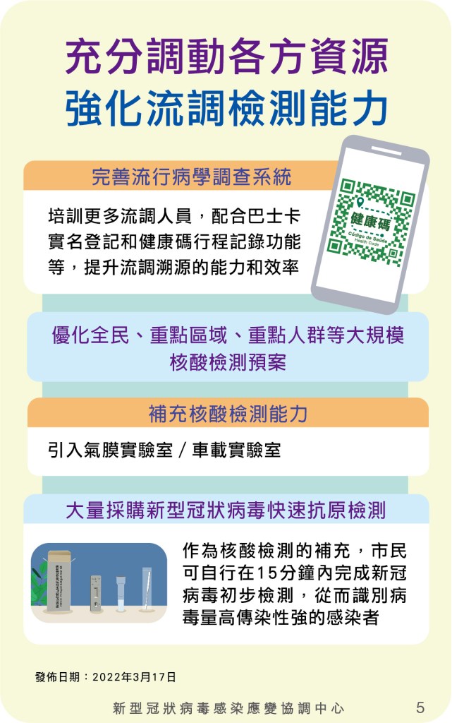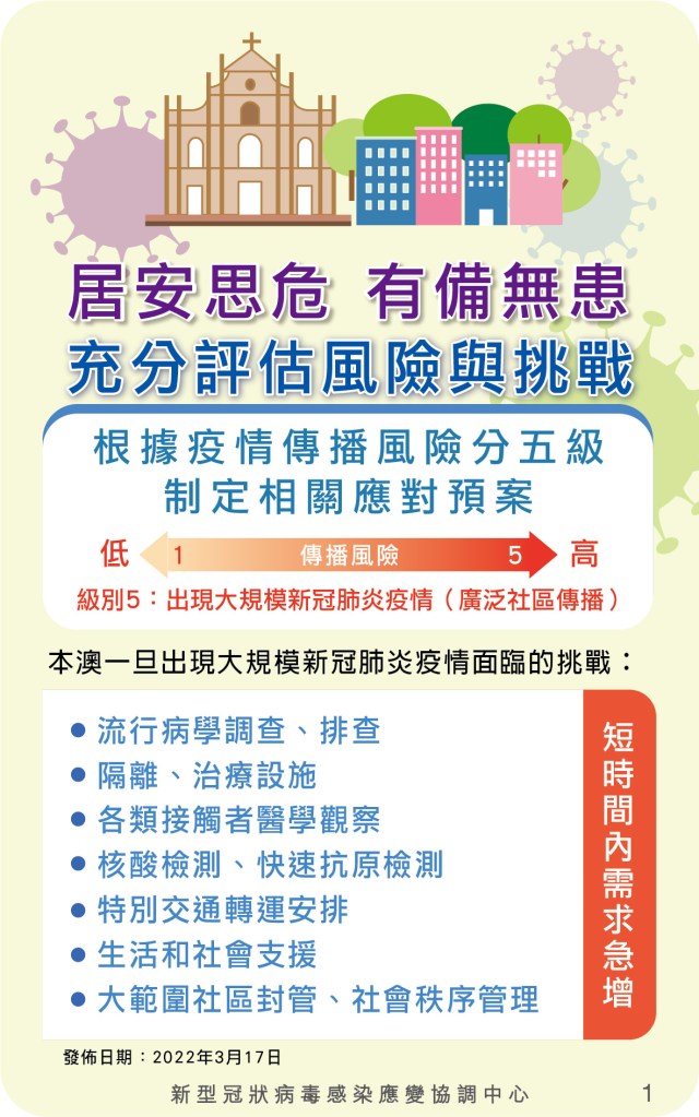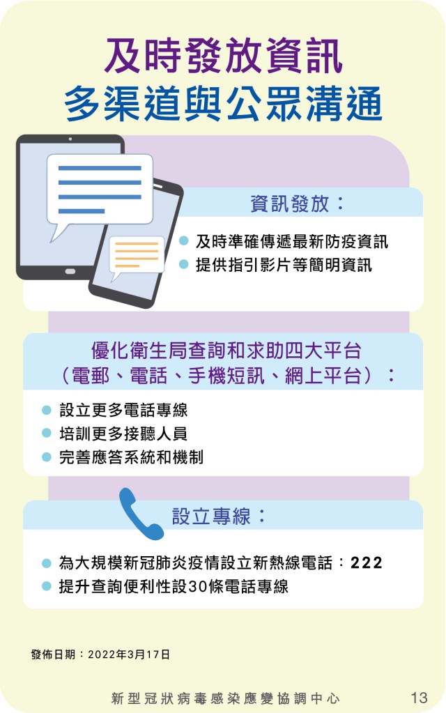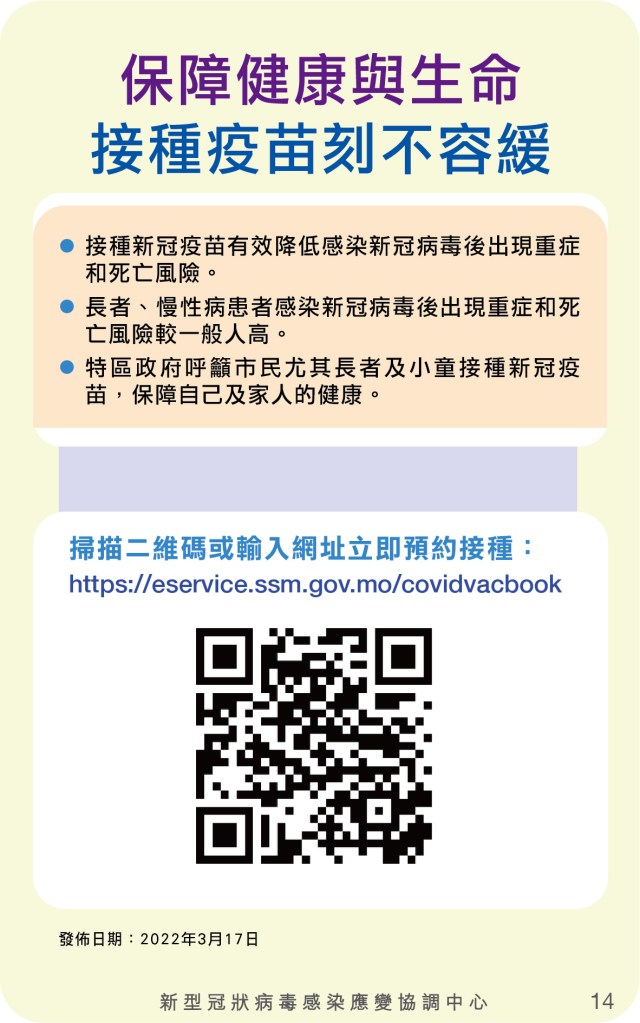 衛生局羅奕龍局長日前於新型冠狀病毒感染應變協調中心記者會上發佈「應對大規模新冠肺炎疫情應急處置預案」,他並再次呼籲市民盡快接種疫苗,特別是長者和小童,保護自身及家人安全;應正確申報、嚴格檢查澳門健康碼,並掃描場所二維碼進行行程記錄;做好個人防護,注意衛生,戴好口罩,保持社交距離,配合政府防疫政策。一旦出現大規模新冠肺炎疫情,將設立新的熱線電話:222,有30條線。此外,衛生局將持續完善4大查詢和求助平台(電話:2870 0800、短訊:6333 7492、電郵:info.cdc@ssm.gov.mo、網頁:https://www.ssm.gov.mo/covidq)。