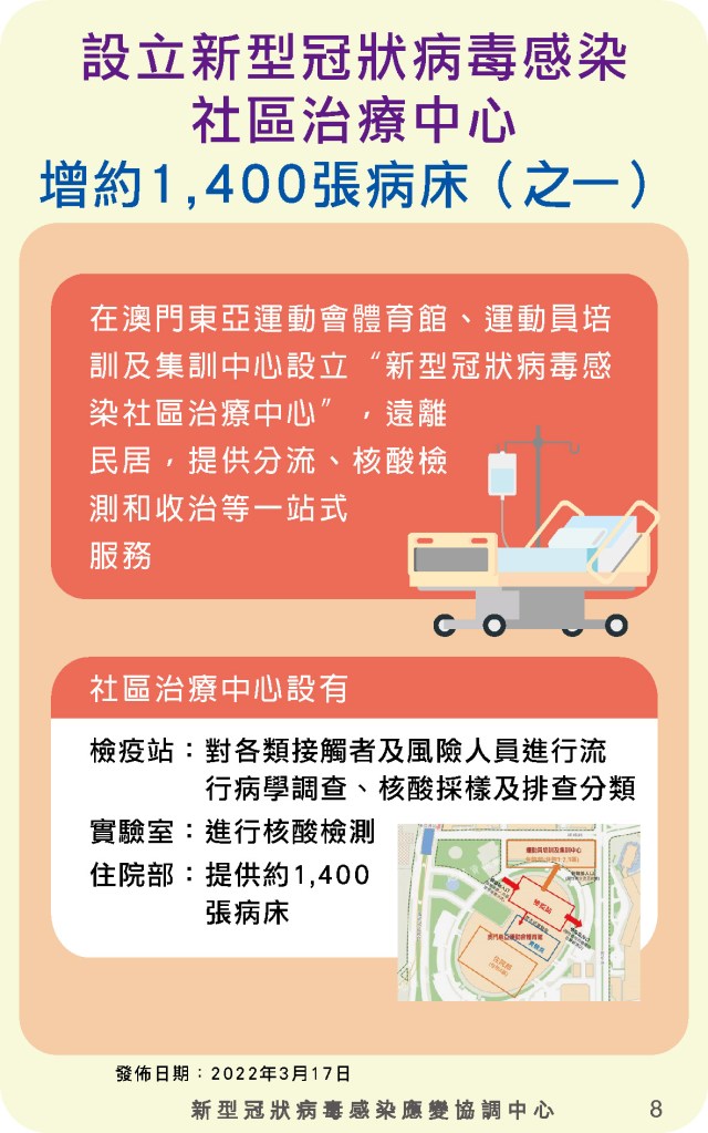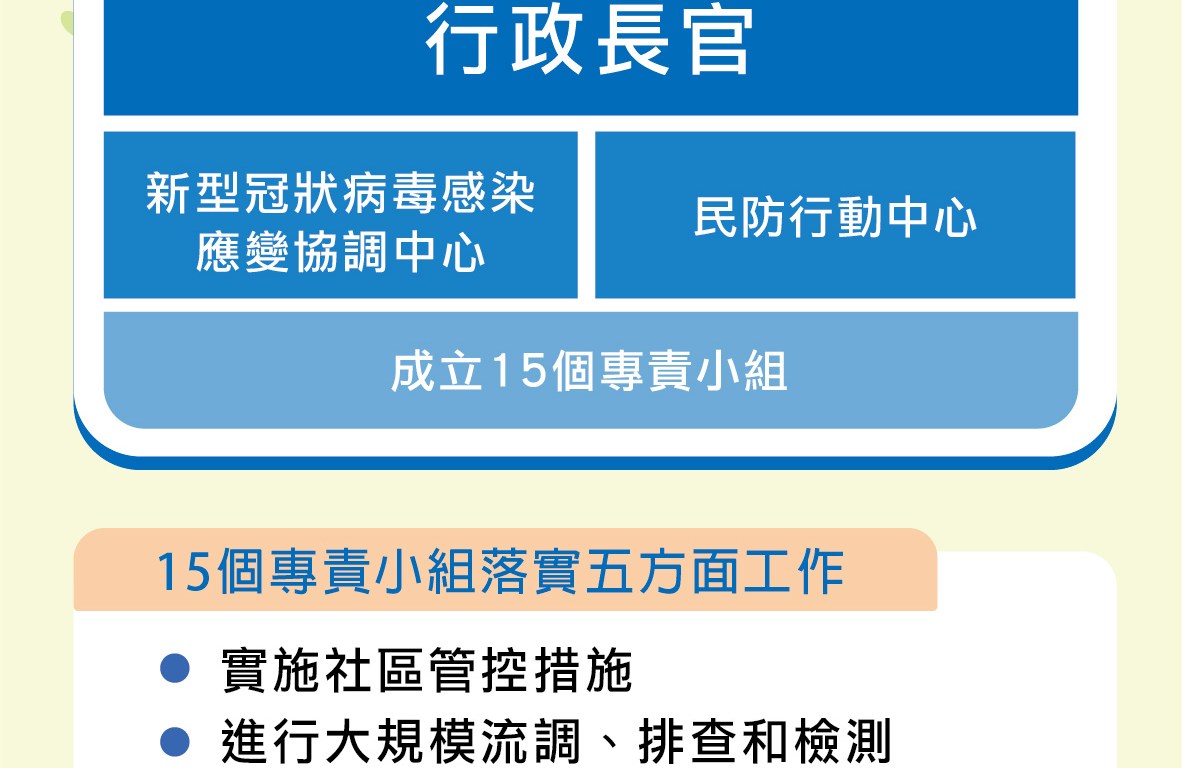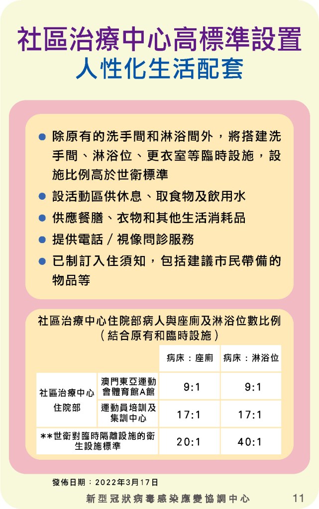 在回答記者的相關查詢時,他補充指出,當局已就相關預案的操作,開展大量的前期協調工作,包括物資採購、人員培訓和社區治療中心的規劃等,一旦因疫情而要啓用社區治療中心,約需要2至3天清場,搭建時間可在7天內完成,即約10天時間可搭建社區治療中心。他強調,任何政策措施都要社會配合和參與才能做好,為此應變協調中心已詳細規劃預案,以便讓公眾及早知悉相應措施的安排。而就購置移動實驗室方面,當局已與不同的供應商接觸,了解具體的要求和標準,本澳的場地可滿足相關要求,一旦需要使用,則要1至2天把儀器運送到澳門,配置和測試時間約需要1至2天,即約需要3至4天就可以啓用移動實驗室,屆時可大大提升本澳的核酸檢測能力。而就人力資源與醫療資源方面,當局亦已做好了相應的需求評估及預案,並與業界人員及不同醫療機構作出溝通,相信可滿足一旦出現疫情時的需求。而社區治療中心內所有廢物均會按「具傳染廢物」處理,由專責小組負責收集,使用專用的動線和電梯運載,運載廢物的推車、容器及電梯,每次使用後均需進行清潔消毒,最終會焚化處理。