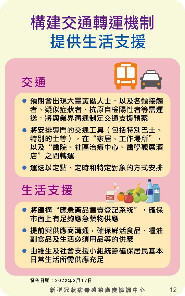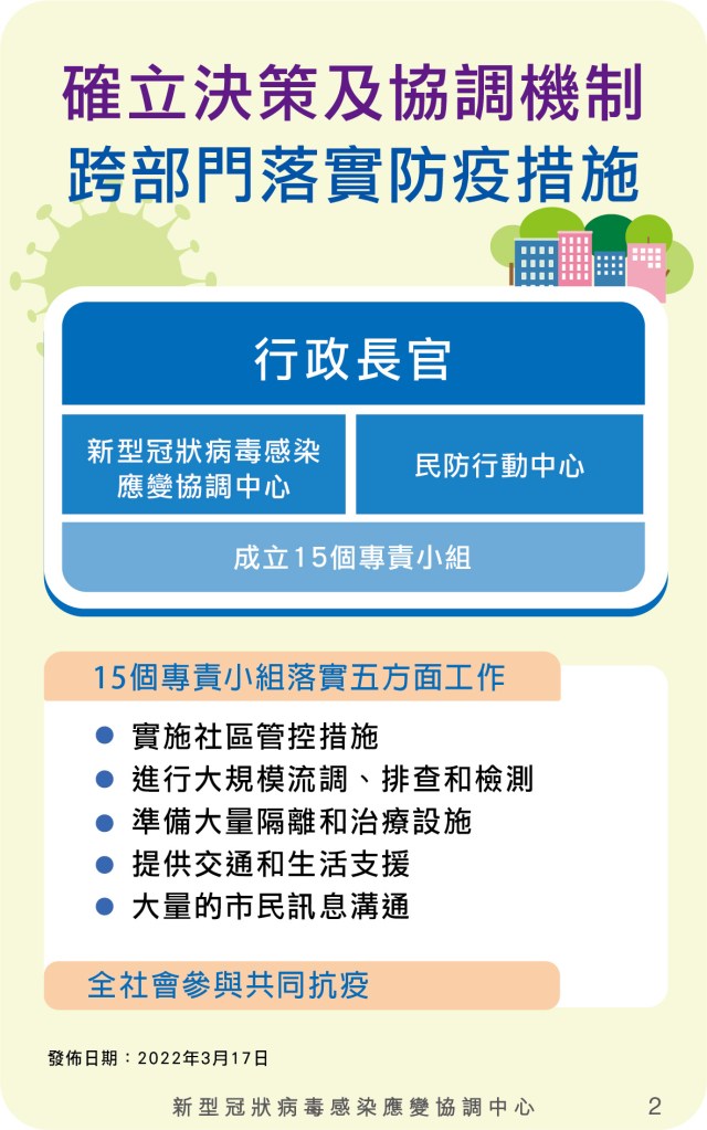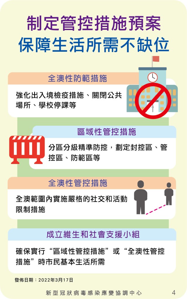 他重申,面對疫情,當局需要制定社區管控措施,包括全澳性防範措施;倘若疫情出現有確診病例在澳門有生活和活動軌跡便需進行區域性管控措施,即分區分級精準防控;倘若疫情有蔓延的情況,便要實施全澳性管控措施,全澳居民實施非必要不出門措施。屆時,將須要組成維生和社會支援小組,確保市民的日常生活用品、食品供應充足,及將建構「應急藥品售賣登記系統」,確保市民可以購買合適數量的藥物。此外,也會為有需要人士提供心理支援工作等。他強調,制定預案並不是預示短期會出現大規模疫情的發生,但政府必須居安思危,甚至考慮到部份極端情況下的應對方案,如不幸出現大規模的疫情而出現病人離世,市政署、衛生局等政府部門將組成專責小組負責遺體處理安排,計劃使用醫院和殯儀館的遺體存放櫃設施,甚至研究租用冷凍櫃暫時存放遺體。他表示,由於烈性傳染病人遺體不能送到澳門以外地區進行火化,為此,當局必須提早規劃,預估未來可能面對的困難,研究在澳門設立火葬設施。