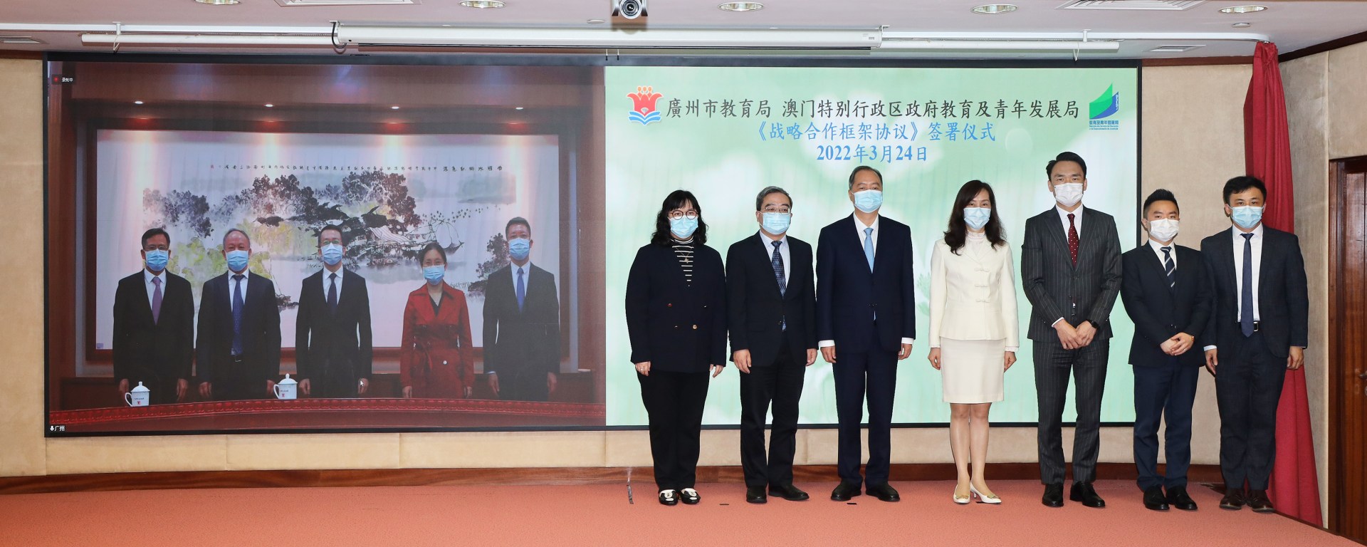 《戰略合作框架協議》簽署儀式以線上視訊會議形式舉行,在澳門社會文化司司長歐陽瑜、中央人民政府駐澳門特別行政區聯絡辦公室副主任鄭新聰、廣州市人民政府副市長江智濤和廣東省教育廳二級巡視員黃友文的見證下,廣州市教育局局長陳爽與澳門特區教青局局長龔志明簽署了《戰略合作框架協議》,未來,雙方將繼續深化穗澳兩地在高等教育、職業教育、基礎教育和青年交流方面的合作。