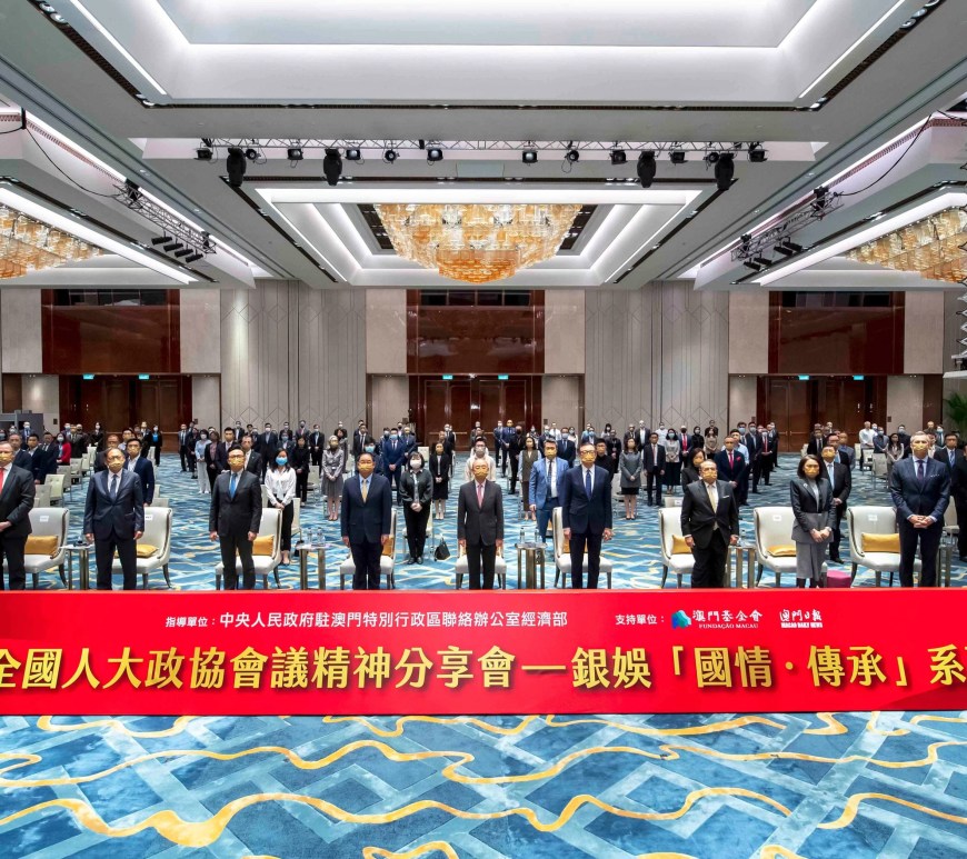 銀河娛樂集團多年來積極推動團隊成員深入認識國家概況、發展趨勢及機遇,以增進其對國情的了解。隨著十三屆全國人民代表大會五次會議及中國人民政治協商會議十三屆全國委員會五次會議在三月中於北京圓滿閉幕,由中央人民政府駐澳門特別行政區聯絡辦公室(下稱「中聯辦」)經濟部指導、澳門基金會及《澳門日報》支持、銀娛主辦的「全國人大政協會議精神分享會—銀娛『國情‧傳承』系列」(下稱「分享會」)於今日舉行。是次分享會邀請到中聯辦經濟部處長孫耀華先生出席;並邀請到全國人大代表、《澳門日報》社長陸波先生;全國政協委員、澳門基金會行政委員會主席吳志良博士;以及全國政協委員、銀娛副主席呂耀東先生就今年「兩會」,傳達意義深遠的「兩會」精神,並分享相關情況及個人體會。