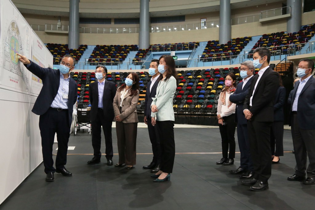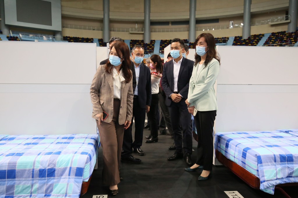 社會文化司歐陽瑜司長、社會文化司司長辦公室何鈺珊主任、體育局潘永權局長、衛生局羅奕龍局長等一行,日前到路氹區視察在澳門東亞運動會體育館、運動員培訓及集訓中心設置的「新型冠狀病毒感染社區治療中心」(方艙醫院)的各項準備工作,及聽取衛生局代表報告相關規劃、佈署和工作的準備情況。歐陽瑜司長聽取滙報及參觀了相關設施後,提出了多項指導意見,務求此一系列的準備工作更為周密。