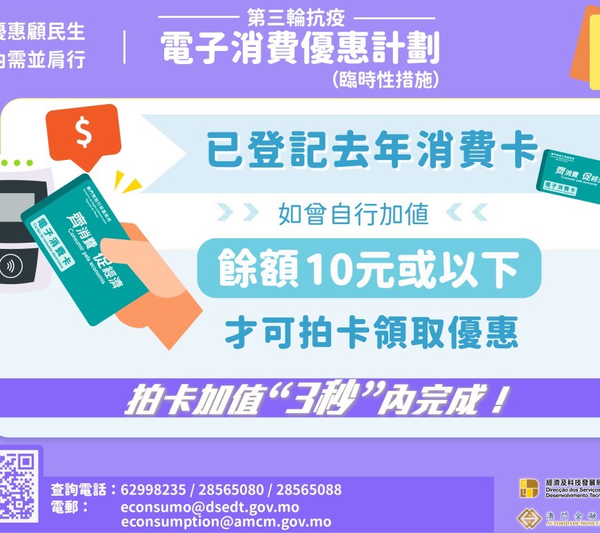 「第三輪抗疫電子消費優惠」首個領取日,截至下午5時,逾20萬居民已領取優惠,過程順暢便捷。其中,47,708名居民完成消費卡拍卡加值或領取新卡。有居民帶同家人多張消費卡前往拍卡,稱每張約1至2秒完成拍卡加值,簡單快捷。不少長者在工作人員幫助下均能順利完成拍卡,對流程表示滿意。現場亦有工作人員協助居民查詢餘額,並仔細提醒居民使用須知等事項。此外,153,906名居民已收到移動支付自動到帳的優惠款項。有選擇以「移動支付」轉移優惠的居民到銀行提交身份確認文件,透過專門窗口辦理,普遍能於幾分鐘內辦妥手續。