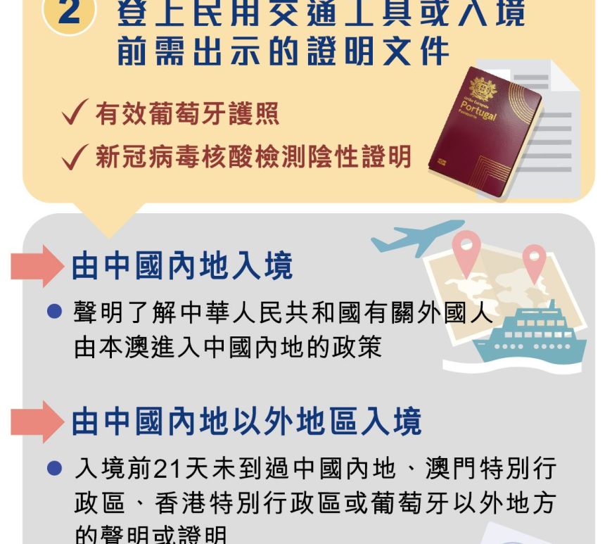 經考慮本地居民的實際需要及評估相關國家的疫情風險和變化後,新型冠狀病毒感染應變協調中心宣佈,根據第64/2022號行政長官批示第三款的規定,自2022年5月27日起,如在入境前21日未曾到過中國內地、澳門特別行政區、香港特別行政區或葡萄牙以外地方(因轉乘交通工具而逗留的地方除外)的葡萄牙籍人士,可在遵守入境條件的前提下,無須獲得衛生當局的事先批准而入境澳門特別行政區。